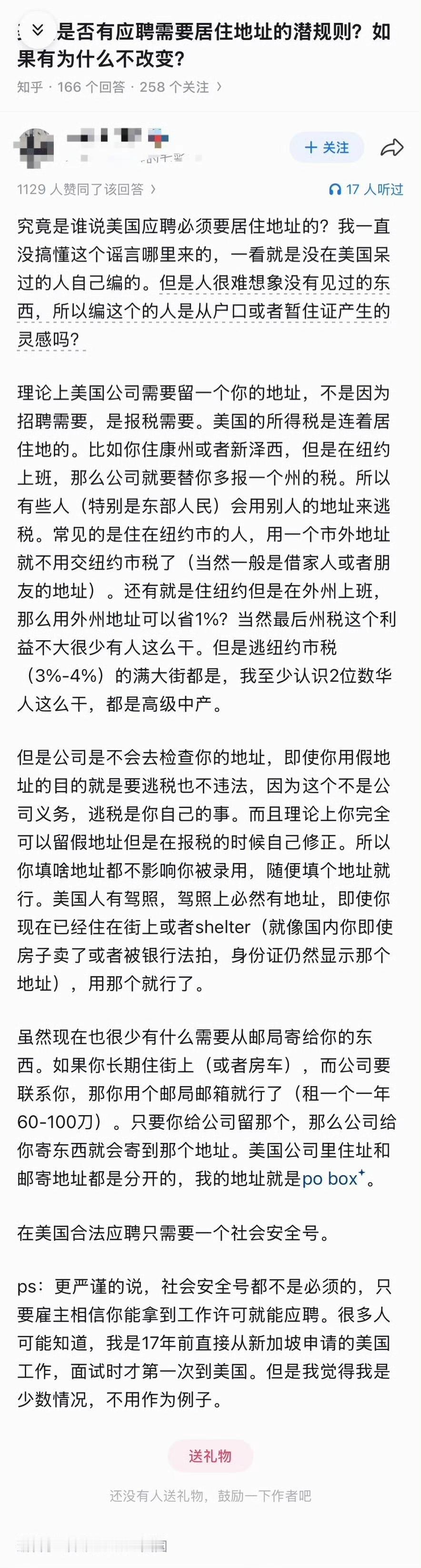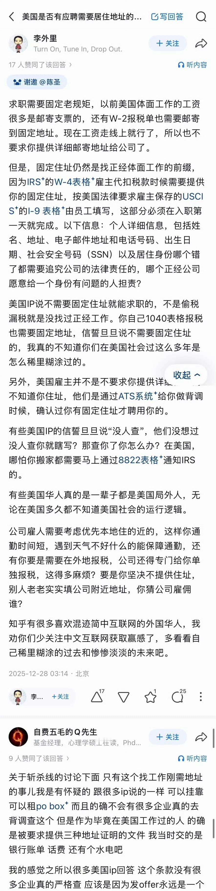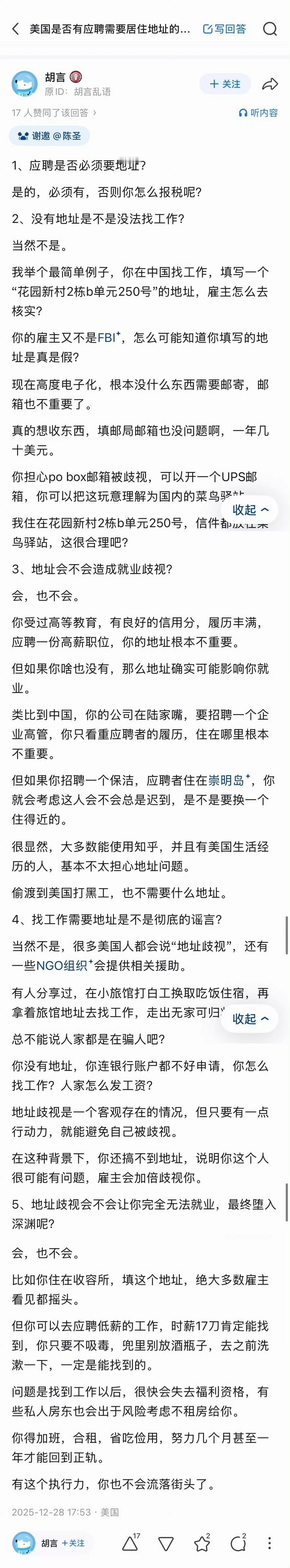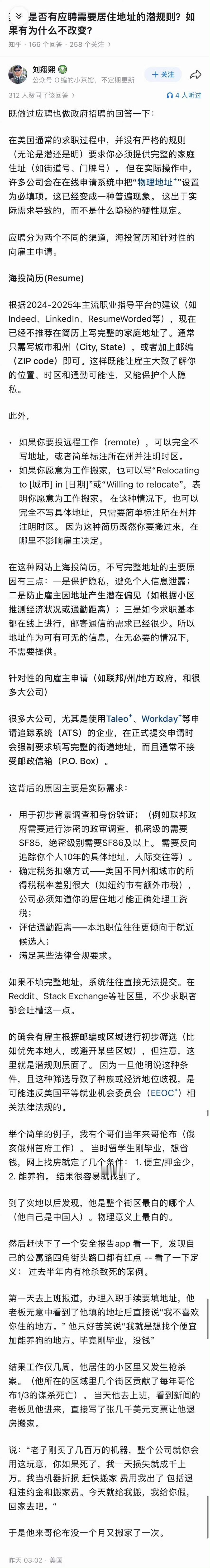 从美国的斩杀线,又延伸出了“住址线”和“邮政编码线”。你的邮编比你的基因更能决定命运。 关于美国找工作要不要住址,图2-9上映了美国iP反对美国iP。 我总结一下:打黑工的,打零工的,刷盘子的要个P的住址。面试时你不填地址,人家就会认为你无住址住,人家也可以选择不录取你,除非人家愿意找你这种没地位如草芥的。你不填地址咋报税?真当lRS是空气是吧?!填了地址,人家HR也会从你的住址看出你的身份和财富。一条街之隔不同的邮政码(住址),绑定了完全不同的教育、治安、医疗咨询、给你的贷款、信用卡额度、保险费率。邮政编码这五位数,代表着你的过去、现在和将来。 同一个城市内,不同的邮编,一年车保险能差上千块。 所以,美国现在出现了很多用po box租地址来洗自己的身份了,投假简历,通过操纵邮政编码的方式来影响雇主对求职者社会经济状况的印象。 所以,住址很重要,特别是对应的邮政编码,就和你的lD一样。没了地址,你就是一个被斩杀下来的人了。 有地址,人家也要区分你是贫民窟、活动板房,还是豪宅。 这可以说明,说在美国找工作不要地址的润人,是打野工、黑工的,还没有到找工作需要填地址的档次,是属于生活在斩杀线边缘附近上的一些人。