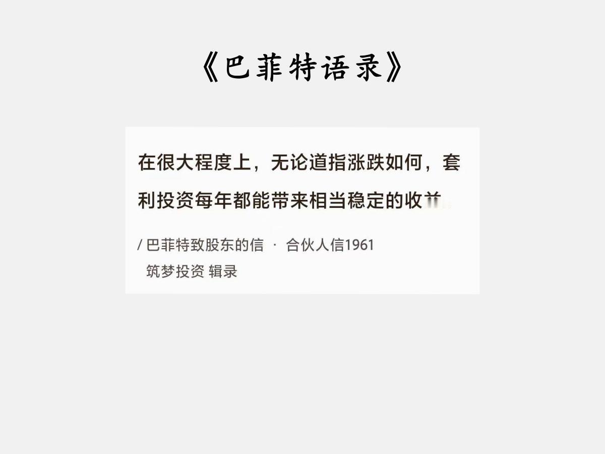 No.044 巴菲特谈“稳稳的套利” 巴菲特曰:“在很大程度上,无论道指涨跌如何,套利投资每年都能带来相当稳定的收益。” 巴菲特口中的“套利类投资”出现在公司行为中,比如公司重组、并购、分拆、要约收购等。所以,它与市场涨跌没多大关系,其风险点来源于公司未按原计划行事。 除此之外,市场上还有其它类型的套利机会。比如中国A股的场内基金溢价套利,它利用的是基金场内价格与净值之间产生的价差进行套利。 投资者在场内按照净值申购基金,然后用场内基金的价格卖出,完成套利。 在2025年12月,白银贵金属价格疯涨,导致白银基金LOF出现抢筹行情,从而让该基金溢价疯狂扩大,最大时达到了60%多。 对参与其中的套利投资者而言,投入500元,就赚到了300多元,妥妥的套利大肉。 除了白银基金外,很多此类的基金都会偶尔出现套利机会,比如标普科技LOF、海外科技LOF等。基金的溢价率数据可以在集思录等网站上查询。