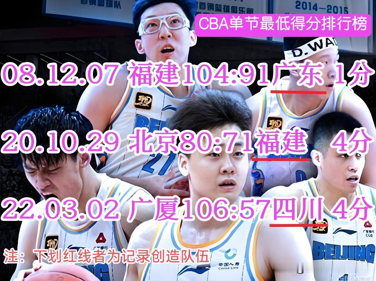 CBA,北京可以单节得9分,也可以让四川单节得6分。 而CBA单节最低得分...1分! 谁也不曾想,CBA霸主、曾经11次夺冠的广东队曾创造过一个尴尬的记录——08-09赛季CBA常规赛福建vs广东的比赛中,后者在第4节仅得1分,创造CBA史上单节最低得分纪录,不过最后的总冠军依然是他们。