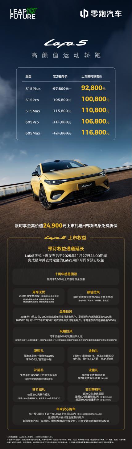 限时惊喜价仅剩1天,Lafa5考虑一下! 零跑品牌十周年发布会上,零跑带来了D19和D99两款旗舰产品,意味着零跑开启了向上之路。不过,零跑也同样重视年轻人市场,Lafa5的热销就足以说明零跑打造出了年轻人喜爱的车型。 年轻人喜欢运动的颜值和内饰,零跑Lafa5就凭借宽体低趴姿态,无框车门,纯平侧窗,19英寸掠翼大轮圈,打造出张力十足的轿跑颜值;而内饰大面积实用仿麂皮+Nappa真皮拼接的应用,更是将轿跑氛围融入年轻人的驾驶日常。 颜值之外驾控也是刚需。Lafa5采用了后置后驱布局,底盘又经过Stellantis联合调校,做到了5.17m的转弯半径,还有6.4秒的零百加速,不仅驾控硬核,更有十足的改装潜力。周末去跑跑山,别提多惬意。 而激光雷达的加持,让Lafa5具备了高速领航辅助、城区领航辅助等功能,也让你在享受乐趣之余,上下班回家的路上不用那么累。 能如此满足年轻人的喜好,也难怪Lafa5 上市3天热销超7000辆,趁着9.28万起的限时惊喜价还有一天,喜欢就赶紧入手吧!