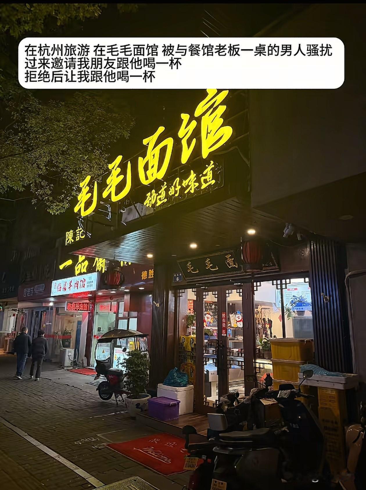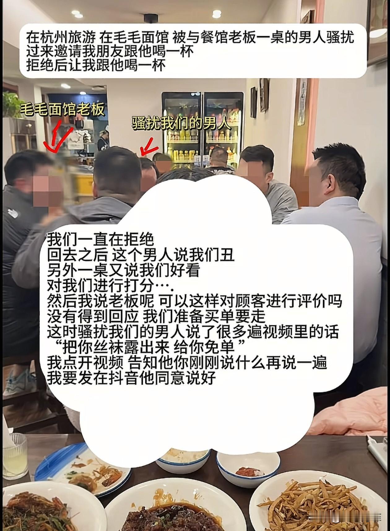 离谱!女子和闺蜜来杭州旅游,在一家面馆吃完饭后,准备买单,结果和老板一桌的男人说了句:“你把丝袜露出来,我给你免单”,女子听完很生气,表示会把视频发出去,但男人一脸无所谓。本来在这之前,男人就已经多次邀请女子喝酒,被女子拒绝。 女子和闺蜜特意选了这家网红面馆来吃饭打卡,想好好尝当地的美食,结果刚落座没多久,邻桌面馆老板和他的朋友就凑过来,轮番邀请女子和闺蜜陪他们喝一杯,两人全程礼貌拒绝。 被拒后这群人更过分,坐回座位就当着女子的面,肆无忌惮对她们的长相评头论足,还互相打分,有人说两人长得不好看,有人又夸好看,全程轻佻没分寸,让女生特别不适。 女生当场找面馆老板求助,质问他放任朋友这么议论顾客合适吗,可老板全程沉默装哑,不制止也不安抚,完全不管她们的感受,她们只能忍到吃完饭准备结账离开。 ​ 没想到临走前,老板同桌的男子更是说出“你把丝袜露出来,我给你免单”这种话,毫无尊重可言。 女子见状立刻拿手机录像,让男子再说一遍,还明确表示要发到网上曝光,可男子一点不害怕,还挑衅说随便发,女子没妥协,事后直接报了警。 女子说自己很喜欢杭州,但就是想让这些人知道,乱说话,冒犯别人要付出代价,不能纵容这种恶行。 女子在异地他乡维权不容易,却没有选择忍气吞声,而是勇敢站出来,这种态度值得支持,不能让这些没有边界感的人有恃无恐。 ​ 目前这件事还在调查中,后续处理结果还没公布。