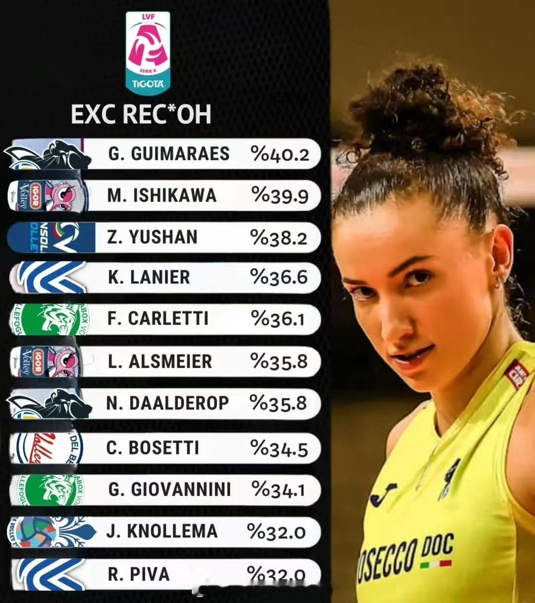 庄宇珊进入意甲女排一传榜单三甲,排名第三(以一传到位率排名)。中国女排意大利女排联赛 加比第一,日本的石川真佑第二。