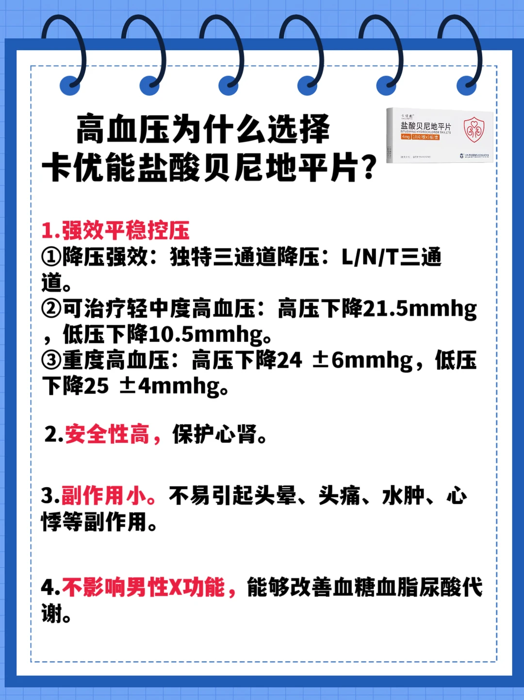 新一代钙通道阻滞剂(CCB)。相比其他地平类降压yao降压靶点更多,升级为三通道协同降压,降压q面。不影响男性x功能,还能改善血糖、血脂、尿酸代谢。