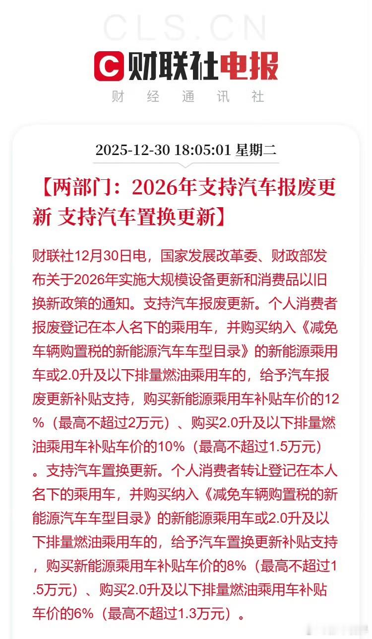 2026年汽车报废置换更新最高补贴不超2万 补贴继续,新能源、旧能源、置换都有!