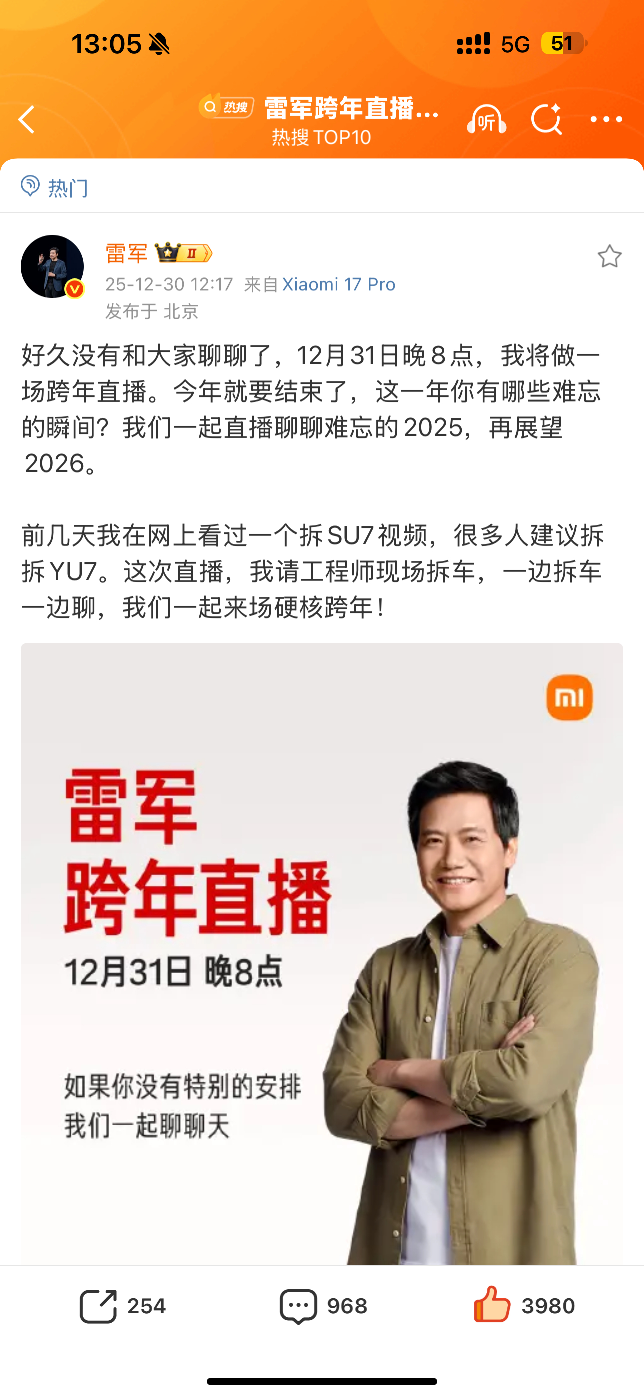 雷军跨年直播拆车前有易车、老章等各路大佬拆车外传,全是清一色好评,明天跨年雷总亲自下场开拆,双向硬核印证,属实让人彻底信服!不得不说,从纽北刷榜到24小时耐力测试,再到跨年夜拆车,小米每一步都在玩别人不敢玩的,次次都在打破行业潜规则、刷新底线!总有人酸小米爱营销,可这份把产品扒光给所有人看的坦诚与勇气,没几个车企能扛住!大胆预言,雷军这波之后,谁会跟风直播拆车?蹲个后续!