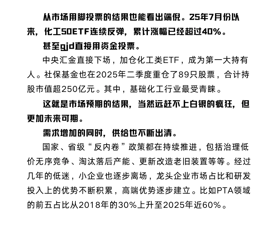25年7月份以来,化工50ETF连续反弹,累计涨幅超过40%。中央汇金直接下场,加仓化工,成为第一大持有人。社保基金也在25年二季度重仓了89只股票,持股市值超250亿元。基础化工行业最受青睐。这就是市场预期的结果,当然远赶不上白银的疯狂,但更加未来可期。