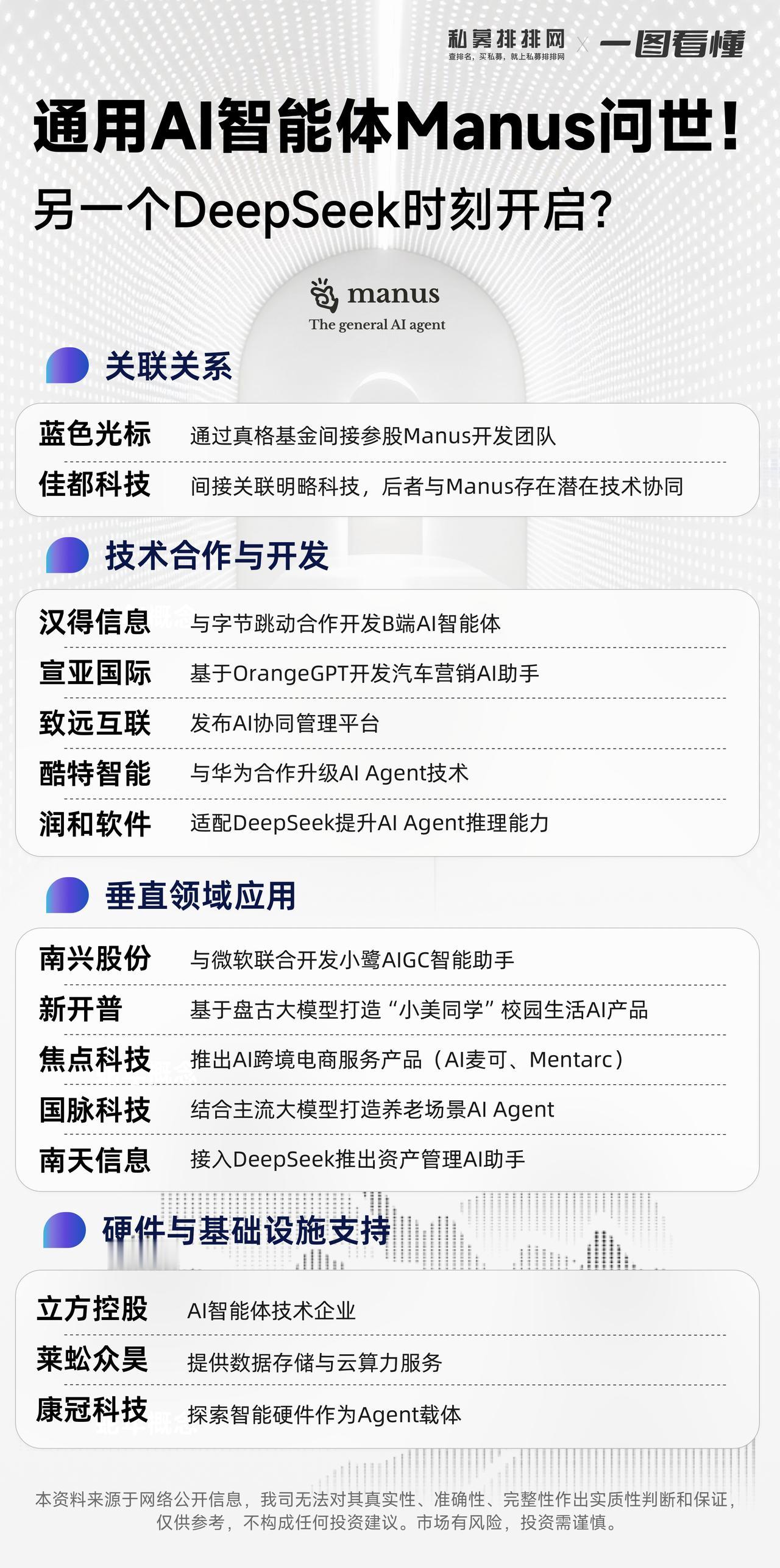 Manus加入Meta!这些Manus概念股或值得关注 (向右滑动图片查看完整名单) 今日,全球首款通用型AI智能体Manus所属的蝴蝶效应公司宣布加入Meta。 后续公司会保持独立运作,创始人肖弘将出任Meta副总裁,Manus将继续通过APP和网站提供产品及订阅服务。 肖弘表示:“携手Meta使我们能够在不改变Manus运作方式和决策机制的前提下,在更强大、更可持续的基础上发展”。 为什么Manus加入Meta能引爆市场? 或源于Manus的硬核实力、Meta收购的重磅信号,以及本土团队背景的情绪催化: 首先,Manus 自身实力足够亮眼。它是一款性能强大的通用型助手,能独立完成市场调研、编程、数据分析等复杂任务。连Meta创始人扎克伯格都坦言自己是其“长期用户”。 这份认可背后,是实打实的数据支撑 —— 截至 12 月初,Manus 已处理超 147 万亿个 token,还创建了 8000 多万台虚拟计算机,技术成熟度可见一斑。 此外,在Meta收购前,Manus正以20亿美元估值进行新一轮融资。 值得一提的是,Manus核心团队源自中国。创始人肖弘是华中科大毕业生,曾创办过获腾讯投资的科技公司,研发团队早期在北京、武汉两地搭建,技术根基扎在国内。 其次,Meta 的收购动作极具行业分量。斥资数十亿美元收购蝴蝶效应,是其成立以来第三大收购案,耗资仅次于 WhatsApp 和 Scale AI。 这种“中国团队研发、出海被巨头高价收购”的案例,直接提振了A股市场对AI智能体赛道的信心。