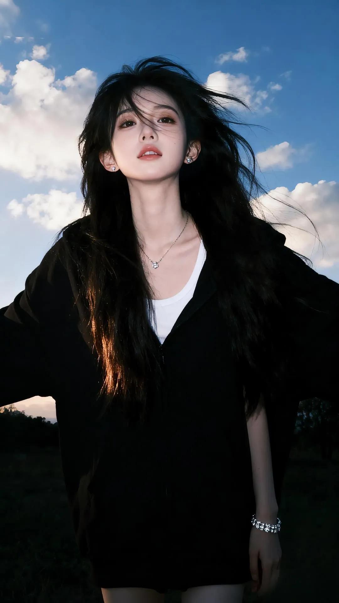 夜晚街头的少女,黑发飘飘,清新动人。街拍 高清美女