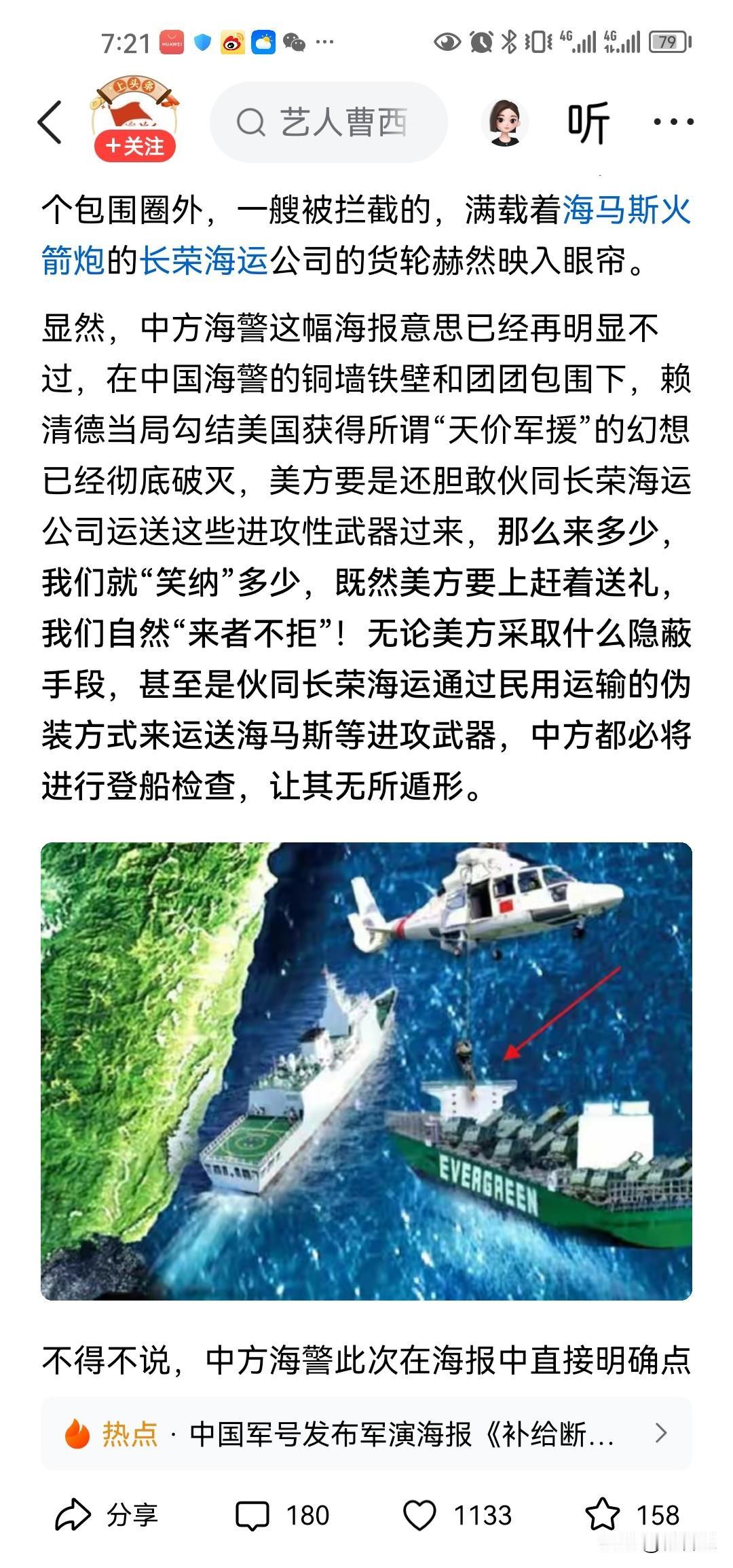 中国对美国与台独分子终于出手了。中国海警名正言顺拦截台湾长荣航运公司运载美国武器的船只。拦截了之后,这些武器就会通通转入中国大陆,也给美国和弯弯给了警告,只要他有多少武器,我们都可以消纳,同时也对台岛内的运输公司提个醒。只要运输武器,我们就可以拦截制裁,他们就不可能与中国大陆发生任何的经济贸易关系了。说到底在南海,在台海都是我们说了算,之前有实力没有展示,现在是时候展示了。