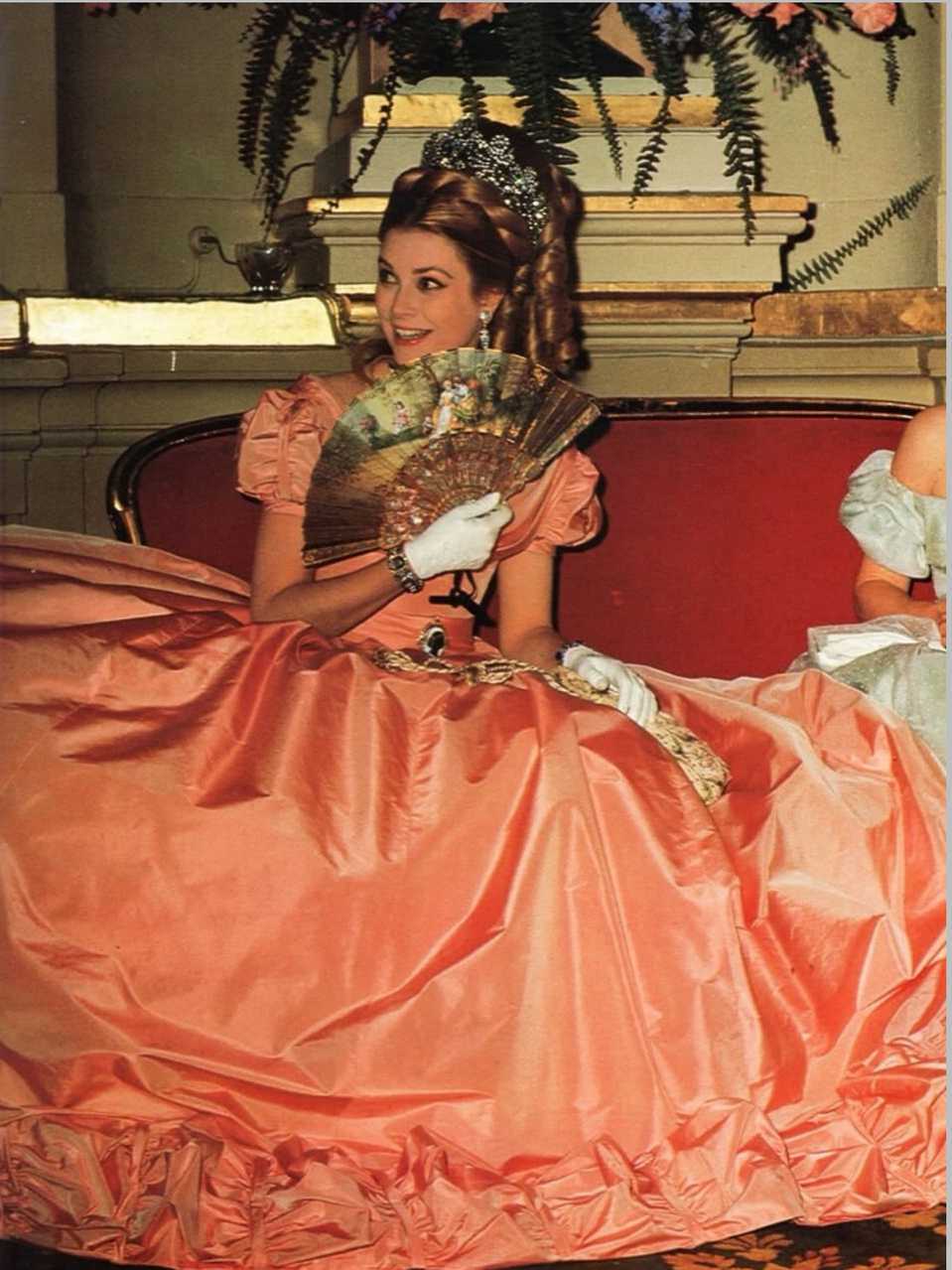 【来自投稿】1966年蒙特卡罗 摩纳哥王妃格蕾丝·凯莉 在皇家舞会上,她身穿粉红色纪梵希塔夫绸晚礼服,佩戴梵克雅宝珠宝