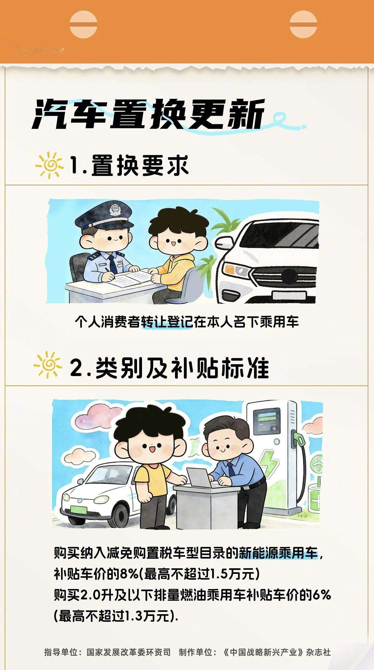 2026年汽车以旧换新补贴政策正式发布:国家发改委、财政部12月30日重磅通知:2026年继续大规模设备更新和消费品以旧换新,汽车补贴优化为按新车价格比例计算+最高上限,新能源优先,燃油车限2.0L及以下。资金规模超5000亿元,全国统一标准执行,旧车需本人名下满1年(防套利)。报废更新(报废旧车买新车):- 新能源车:车价12%,最高2万元。- 2.0L及以下燃油车:车价10%,最高1.5万元。置换更新(转让旧车买新车):- 新能源车:车价8%,最高1.5万元。- 2.0L及以下燃油车:车价6%,最高1.3万元。与2025年对比核心变化:- 补贴方式:从定额(新能源报废2万、置换1.5万等)→比例+封顶,更适配不同价位车。- 低价车:补贴可能减少(比例计算)- 高价车:更容易封顶受益- 旧车要求:强化持有满1年,防止短期套利。- 新车条件:新能源须在购置税减免目录,燃油限2.0L及以下。- 执行机制:全国统一平台,资金更充足、审核更严。举例计算(假设新车发票价,不含税)- 买20万新能源报废更新:补贴2.4万 → 实际2万封顶- 买15万新能源置换更新:补贴1.2万- 买30万以上新能源报废:直接封顶2万
