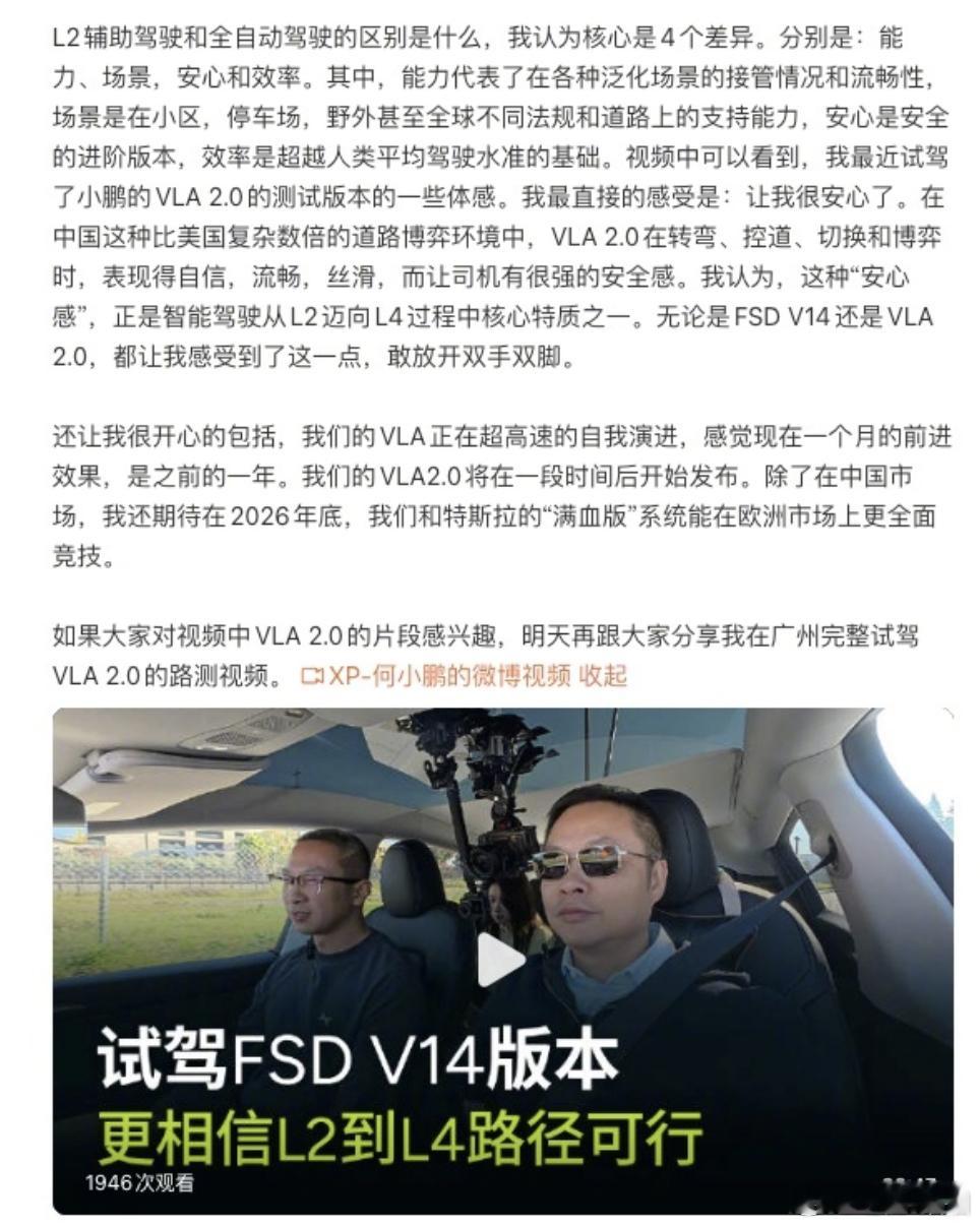何小鹏9大场景美国对比特斯拉 小鹏的战略,就是跟着特斯拉。前往美国和小鹏汽车自动驾驶负责人刘先明一起体验了特斯拉最新的FSD V14,回国通过9大场景对比测试小鹏第二代VLA这波小鹏二代VLA也是继续拿着FSD V14满血版来对比,要从L2直接到L4的体验,要求有点高
