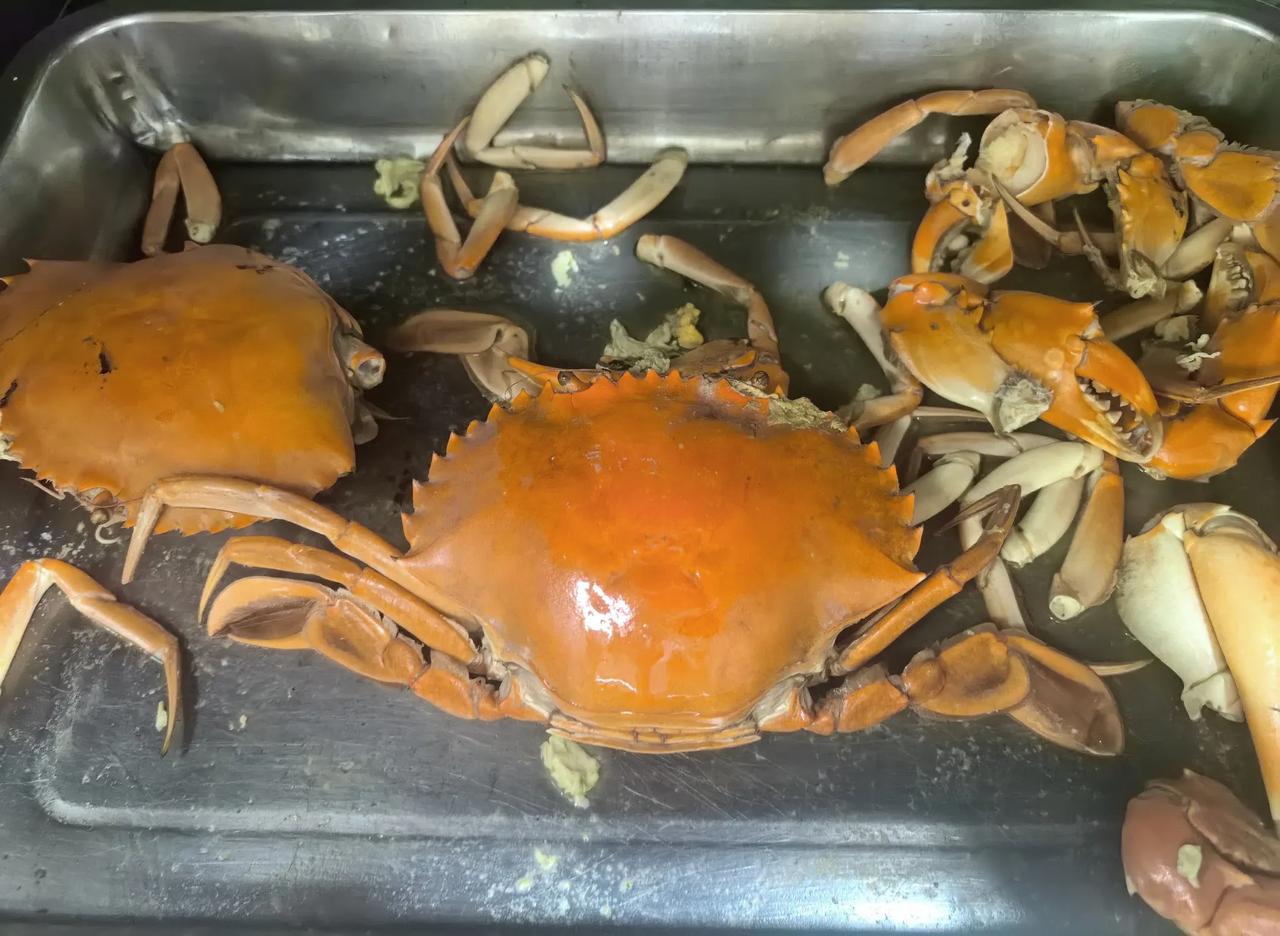 今天船上晚餐有一道菜是螃蟹,我因为有点事情所以吃晚餐去的比较晚。等我到了餐厅一看,螃蟹还剩下两只,其中一只光秃秃的一只脚也没用,另外一只螃蟹也没剩下几只脚,盘里面倒是剩下不少脚。 我比较好奇的是螃蟹是蒸熟的吧,为什么蒸的螃蟹脚都掉了,还是说螃蟹买来的时候脚就已经掉了,真的搞不懂,看着掉脚的螃蟹,一点食欲都没有,所以直接没有吃螃蟹!