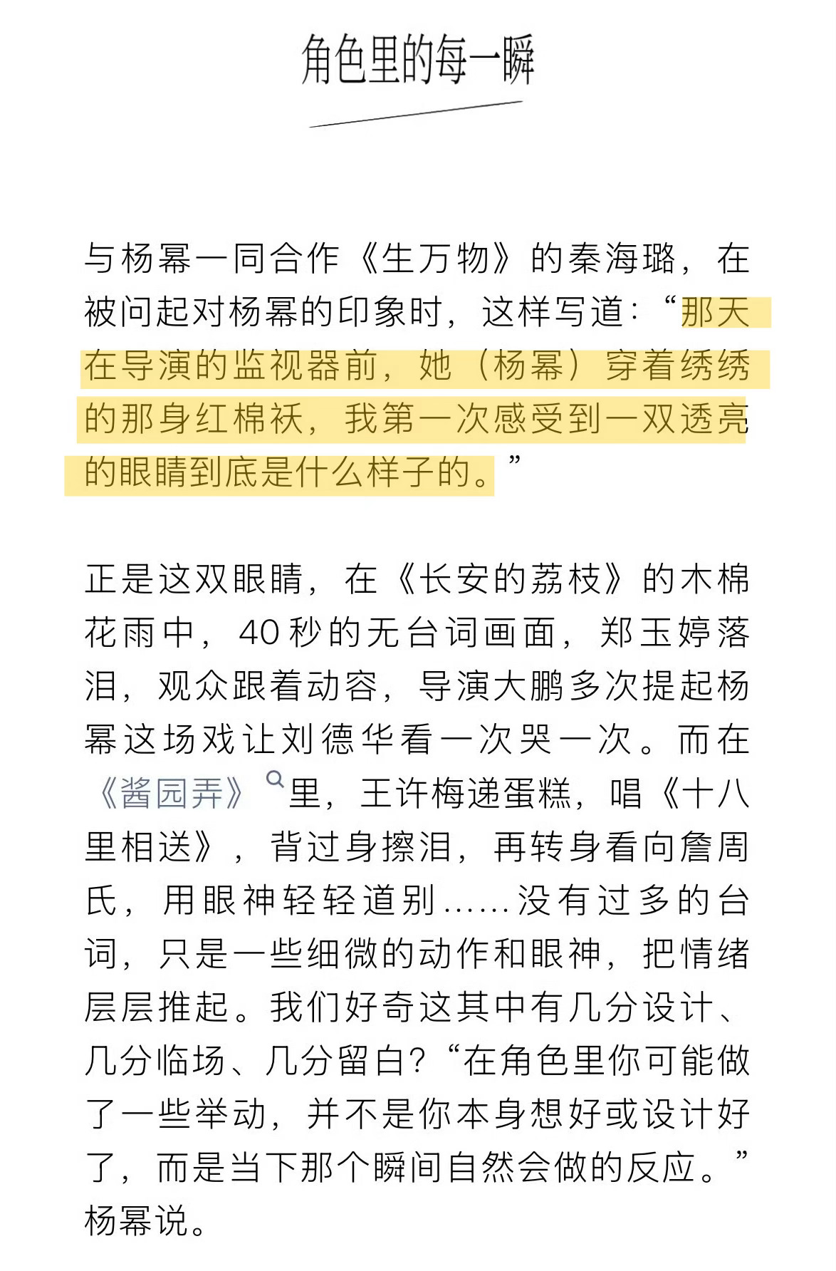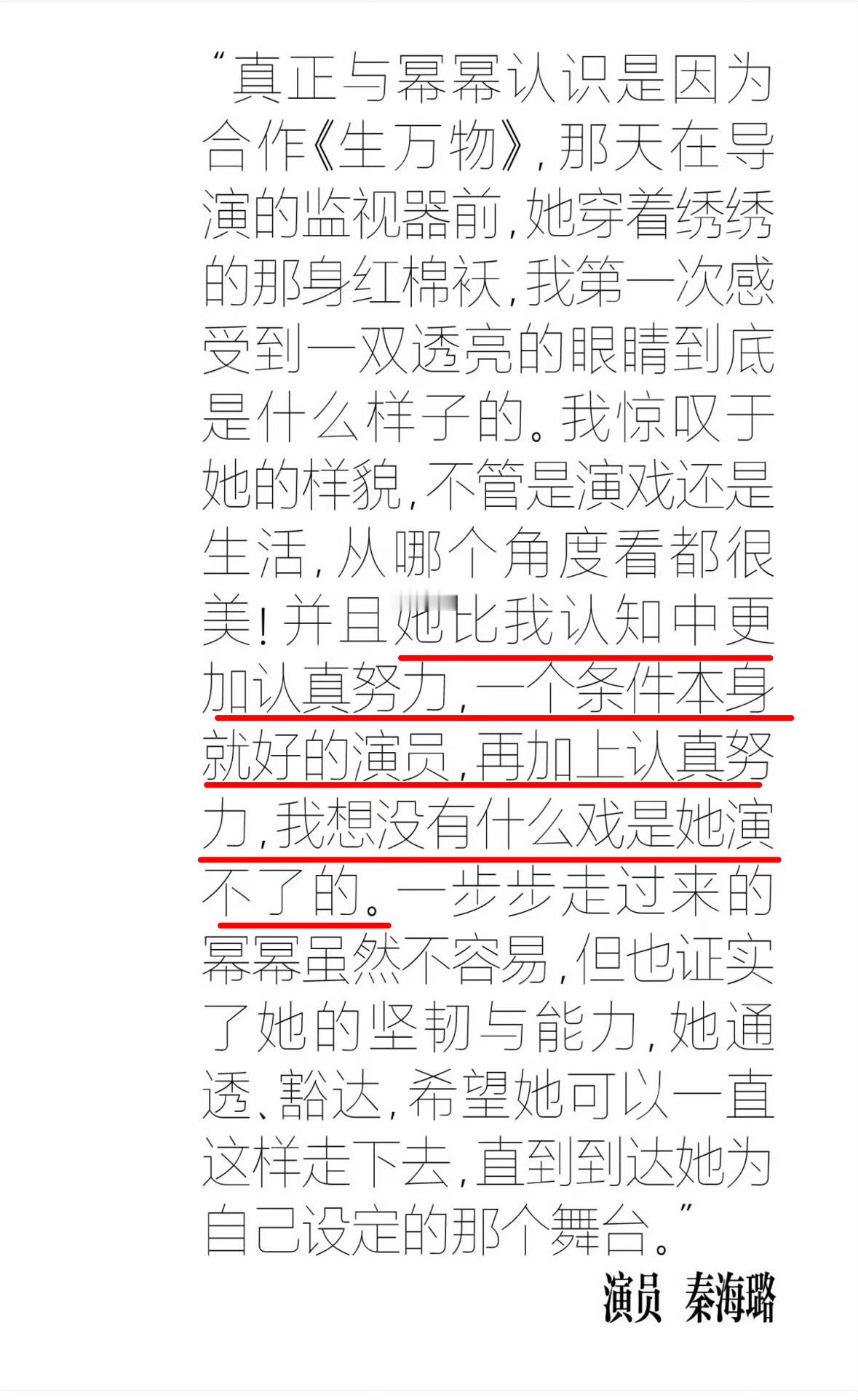 秦海璐对杨幂的印象秦海璐多次夸赞演员杨幂认真努力通透~“第一次感受到一双透亮的眼睛是什么样的”“她比我认知中更加认真努力,一个条件本身就好的演员,再加上认真努力,我想没有什么戏是她演不了的。一步步走过来的幂幂虽然不容易,但也证实了她的坚韧与能力,她通透、豁达,希望她可以一直这样走下去,直到到达她为自己设定的那个舞台。”“她真认真,一字不差,极聪明的一个人”