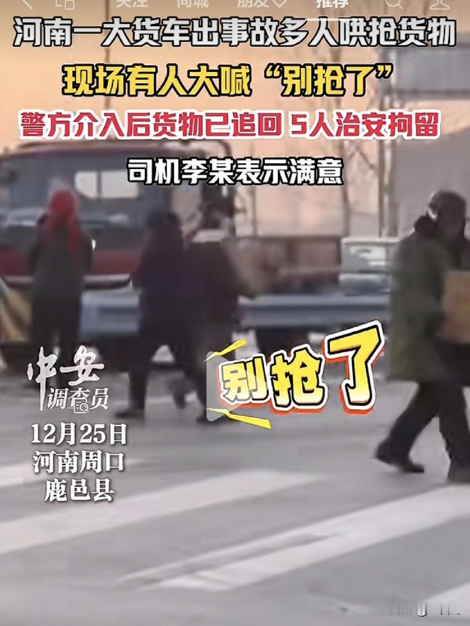 货车翻车,货被“捡光”,警察出手全追回!5人喜提“拘留所体验卡”! “车祸现场秒变‘零元购’?想多了!” 前几天,河南鹿邑县一辆拉日化用品的大货车出了事故,货撒了一地。 没想到,一些路过群众不是帮忙,而是开启‘抢货模式’,把洗发水、沐浴露往自家兜里装,现场一度混乱。 视频传到网上后,网友们都看傻了:“这算趁‘祸’打劫吗?” 当地镇政府和派出所民警火速赶到,一边维持秩序,一边清理货物。更硬核的操作在后头——警察叔叔顺着线索,把被拿走的日化用品一件不落,全部追了回来! 12月26日,官方通报来了:5个参与哄抢的人,已被治安拘留。 货车司机对处理结果表示满意,事故也在正常处理中。 时间线全程高能: 👉12月25日早6点:货车撞了,货撒了,有人开始“捡”了。 👉同日上午:民警到场控制局面,视频上网引发热议。 👉12月26日:官方通报:货已追回,5人被拘,其他人被批评教育。 👉12月27-28日:媒体齐发声:“法不责众”过时了,顺手牵羊必被捉! 网友辣评: “这下好了,为了几瓶洗发水,换来拘留所‘深度游’。” “建议把这些人的脸打码做成海报,标题:手别滑,会拘留。” “以前是‘捡到就是赚到’,现在是‘捡到可能戴手铐’。” 车祸现场不是“免费超市”,别人遭难更不是“发财机会”。如今监控遍地、执法从严,“顺手牵羊”牵走的可能就是自己的自由。 记住:手莫伸,伸手必被追——连洗发水都给你追回来! 事情结局很舒适,法律从不闹着玩! 道路千万条,守法第一条。哄抢一时爽,事后拘留所里躺。 素材来源:中安新闻,侵联删!