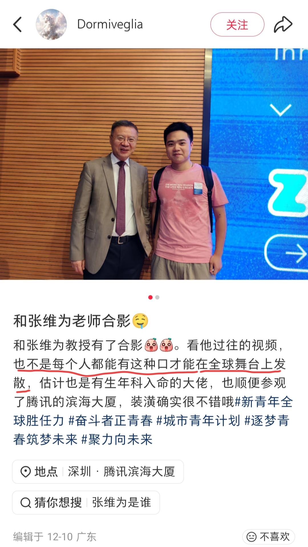 青年谈与张维为教授合影的感受。 这位青年与张教授合影过后,还谈了自己的感受。他说他看过张教授以往的视频,又谈到不是每个人都有这种口才能在全球舞台上“发散”。 从他的言语之间,可看出他对张教授是非常的崇拜,并认可张教授的影响力。我们看图片中的张维为教授,面带微笑,与短袖青年亲切合影。 话说回来,与张维为教授合影也是简单的。碰到他后,想合影对他说,基本上都是OK的。抛开张教授的观点不谈,这也是张教授平易近人的一面。