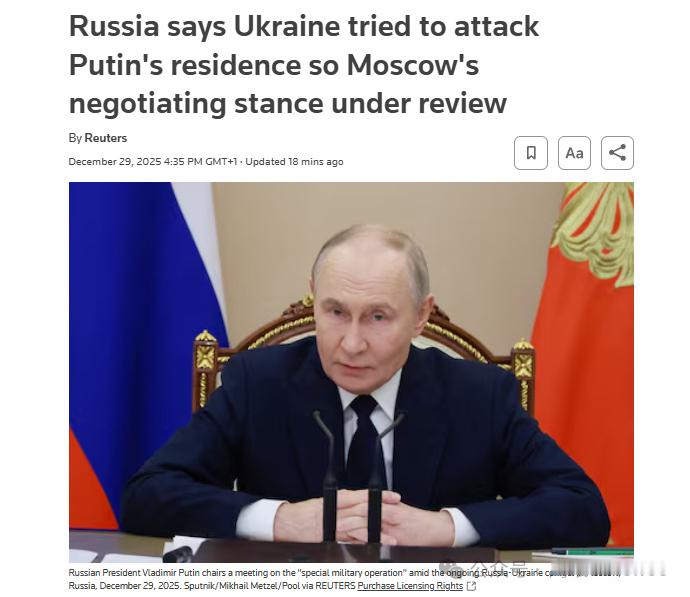 烽火问鼎计划 俄罗斯外长拉夫罗夫发表声明,宣称当地时间12月28日夜,乌克兰向俄罗斯总统普京在下诺夫哥罗德州的总统官邸发动了“恐怖袭击”,“动用了91架无人机,所有无人机均被防空部队摧毁,暂无人员伤亡报告。”拉夫罗夫称俄罗斯政府的谈判立场将据此进行调整,决定进行报复性打击,目标和时间均已确定,但俄罗斯政府无意退出谈判。包括俄罗斯外交部发言人扎哈罗娃、俄联邦国家杜马安全委员会主席卡尔塔波洛夫等人在内,诸多俄罗斯政府官员、议员们纷纷发声,坚称乌克兰攻击普京官邸的行为“绝不可饶恕”,“有普京就有俄罗斯俄罗斯,没有普京就没有俄罗斯”,云云。乌克兰政府立即否认了这一消息,称俄罗斯政府正在散布虚假消息,准备以此为借口袭击基辅市中心的政府大楼,并借此改变谈判立场;泽连斯基称俄罗斯政府的说法“完全是谎言”,“俄罗斯试图破坏乌克兰和美国在和平谈判中取得的所有进展”;乌克兰媒体则称克里姆林宫在编造一个“明显虚假的故事”,目的是拒绝采取必要措施结束战争,“这是俄罗斯政府典型的欺骗手段”。