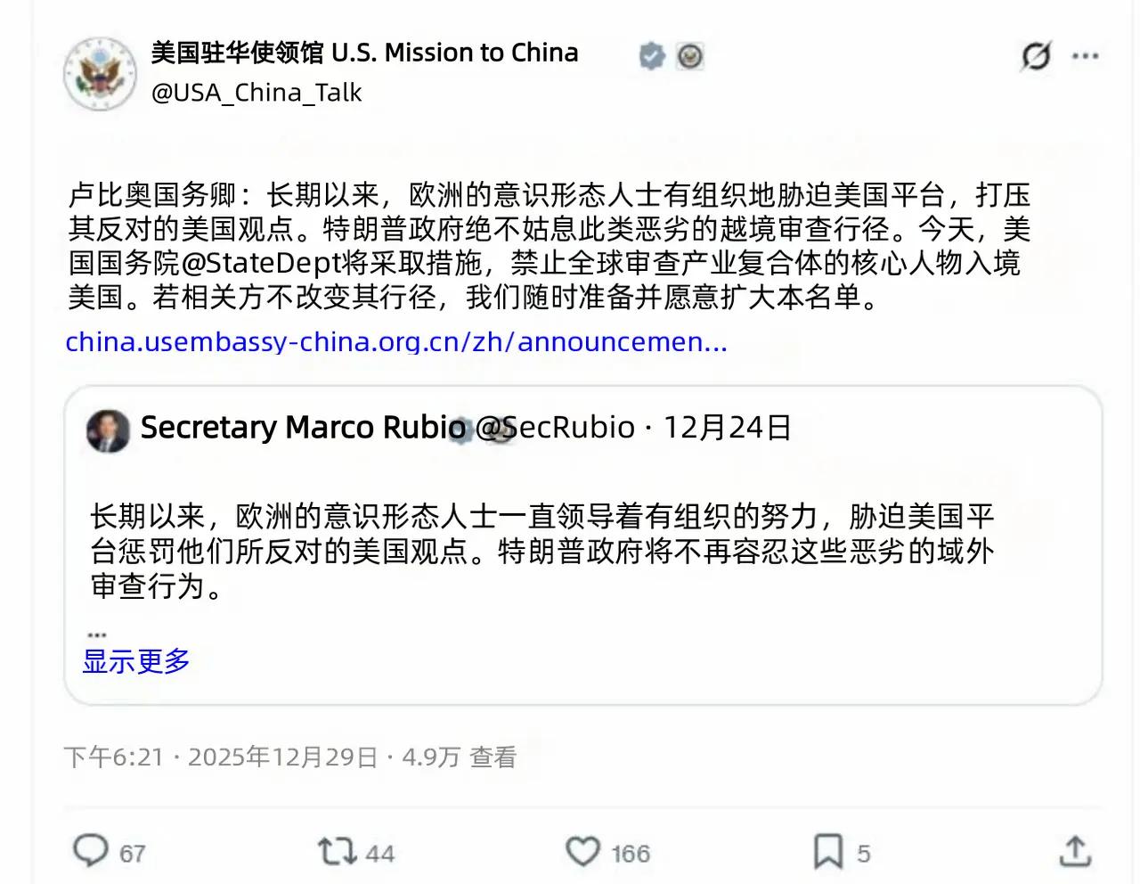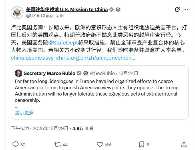 美国禁止欧盟数字审查5个官员入境美国。鲁比奥也说了,不排除扩大本名单。 欧盟也真的是一个笑话。自己至今都没有一个自主的平台,还在那装逼,居然想着去美国审查x、谷歌等平台,对它们进行罚款还不够。 12月5日,欧盟依据《数字服务法案》(DSA)对马斯克旗下的x平台处以1.2亿欧元罚款,理由包括蓝标认证误导用户、广告不透明、拒绝开放数据访问。 此前欧盟已对谷歌开出29.5亿欧元反垄断罚单。苹果、Meta亦因限制第三方支付被罚款数亿欧元。 马克龙:此举侵犯欧洲数字主权。 此次被制裁的带头人布雷顿:麦卡锡主义阴风重现。 没啥实力,也没啥道德,一个二百五还对有实力的指手画脚,秀莫名其妙的优越感,这种奇形怪物是怎么活到现在的。欧洲至今没有自己的社交软件,用的都是美国的。连越南都有越南版VX——zalo。有本事欧洲自己搞社交软件。 审查境外组织也是美国人被欧洲人恶心了以后搞出来的。