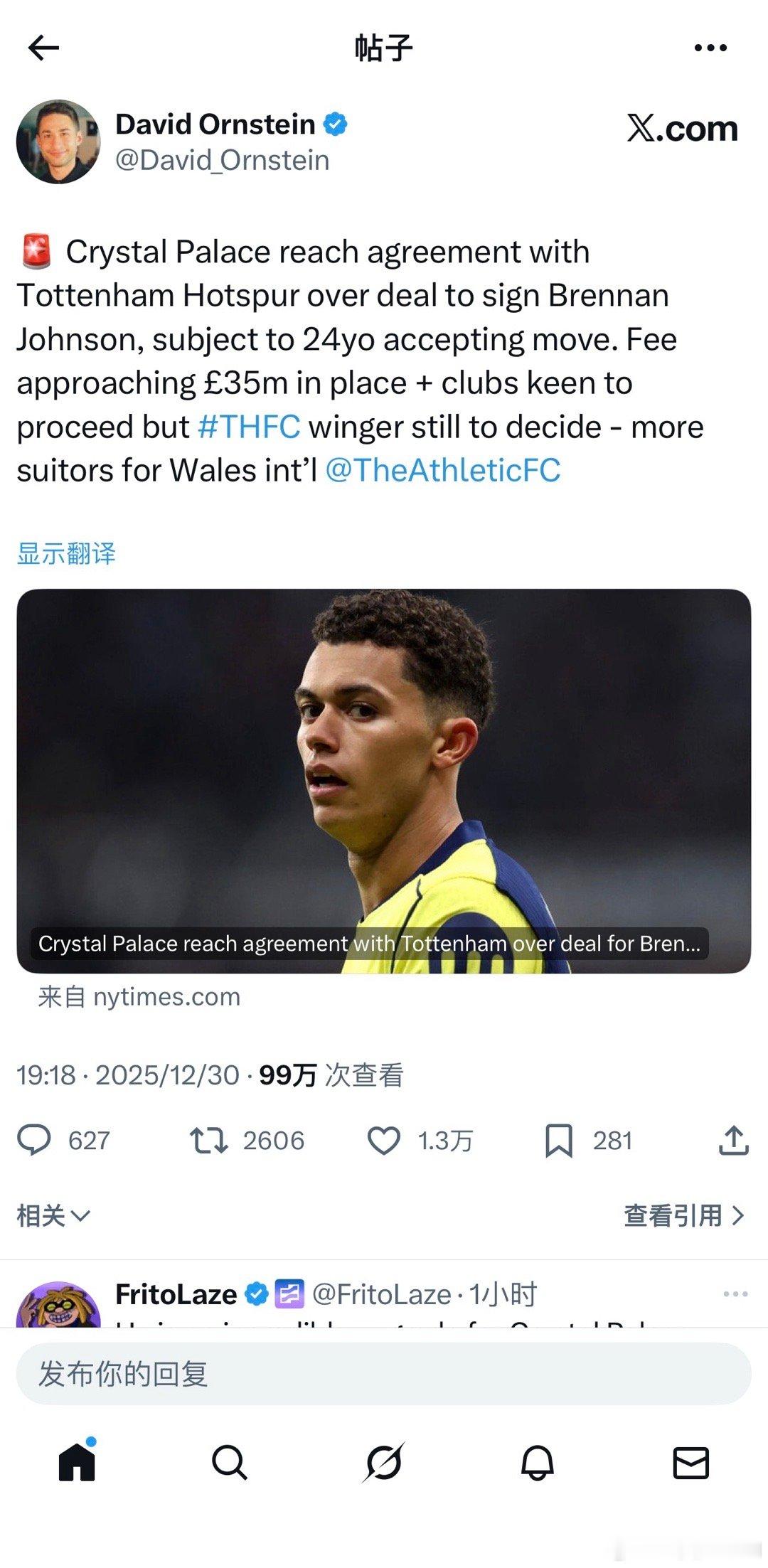 TA DO:水晶宫与托特纳姆热刺已就布伦南·约翰逊转会达成协议,转会费约3500万英镑。目前交易仅待这位24岁威尔士边锋同意个人条款即可完成。尽管两家俱乐部均希望推进转会,但这位热刺球员尚未做出最终决定,据悉还有其他俱乐部对其有意。
