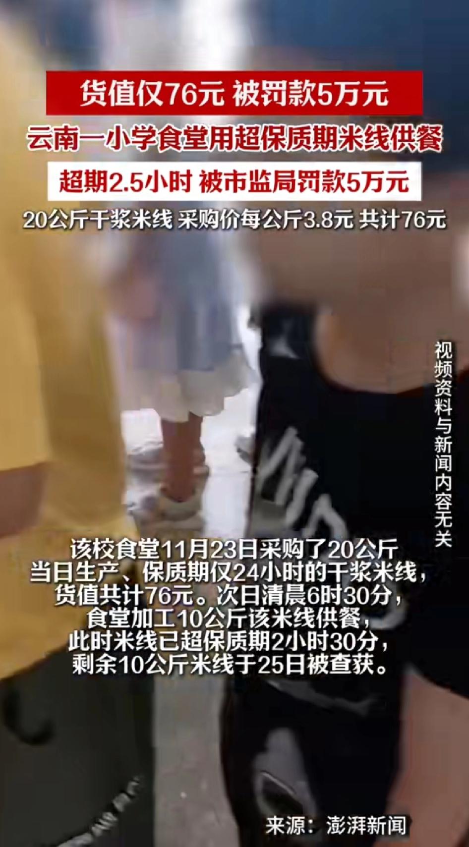 云南一小学食堂用超过保质期米线供餐,超期2.5个小时 被市监局罚款5万元。 云南昆明这事儿真挺让人无语。12月25日的通报,阿旺镇中心学校芋头塘小学食堂用超保质期2.5小时的米线给学生吃,被市监局罚了5万。 学校食堂饮食不可马虎,更不能为了节省成本,而抱有侥幸的心理。既然已经过期了就不能再给学生食用了。 这食堂11月23日花76元买了20公斤米线,保质期就24小时。可24日早上6点半,工作人员还是把10公斤超期米线做成70多份早餐给学生,温度高虽然只超了2.5个小时,不代表没有变质的可能,毕竟只有24小时的保质期。 没吃完剩下的10公斤25日被查获。好便宜的米线,难以想象76元就能买40斤米线。 好在没学生吃坏肚子,不然更严重。虽说76元货值和5万罚款差距大,但校园食品安全不能开玩笑,孩子肠胃弱,一旦出了问题就是大问题,谁都担不起。这处罚也是给其他学校食堂提个醒,别再干这种事儿。 只有严惩才能起到警示作用,有些时候该罚款就要罚款,只有出了血才能长记性。