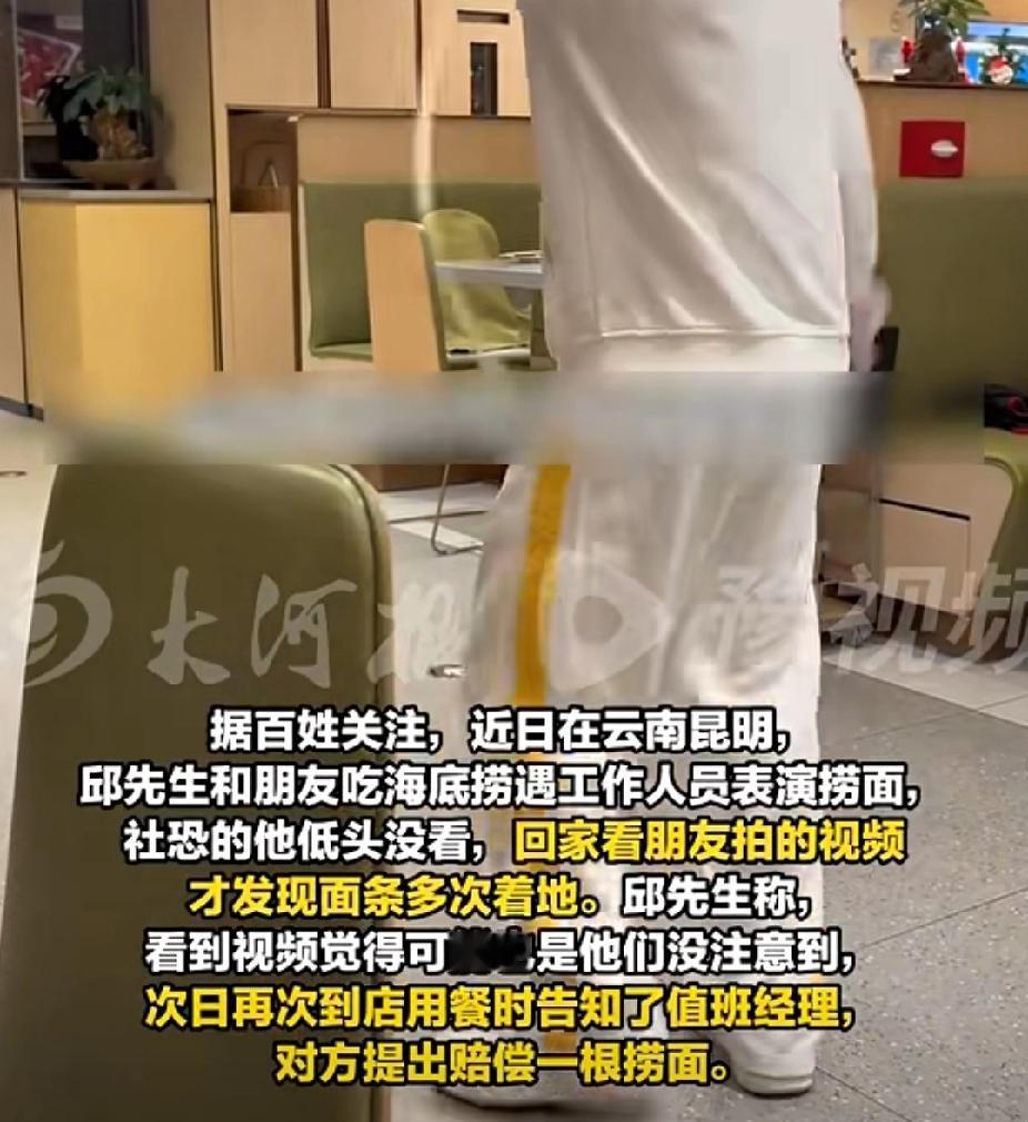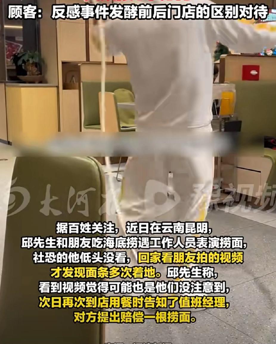 海底捞服务员表演甩面却多次将面甩到地上!12月29日,云南昆明邱先生和朋友去海底捞吃饭,到拉面环节邱先生因为社恐就没有观看海底捞员工的甩面表演。 到家后邱先生观看朋友拍摄的视频时,意外发现甩面表演的员工在甩面过程中,好几次面都甩到了地上。为了确认,邱先生又邀请朋友一起多次查看视频,发现确实多次接触了地面。 次日,男子再次去该店吃饭时就将情况告知了值班经理,值班经理表示赔偿一根新的捞面给邱先生。 邱先生将视频发布到了网上,海底捞品牌官方很快就有人私信,表示可以赔偿两根捞面,并邀请男子品尝店内的新品。第三天区域负责人又联系到了邱先生,表示可以给邱先生免单,并以后无限次吃捞面,最后又改成一个月内免费吃捞面。 对此,邱先生表示对这种事件发酵前后门店截然相反的态度很反感。 对此,有网友表示:海底捞用来表演的拉面并不会真的给顾客吃,会给顾客在重新扯一根拉面下锅。 但有的网友表示,表演的拉面会直接放进锅里煮给顾客吃。 对此,你怎么看呢?表演用的拉面到底会不会给顾客吃呢?海底捞 餐饮店的那些事