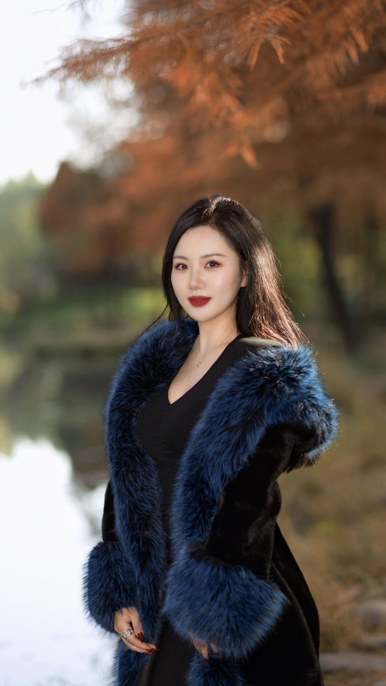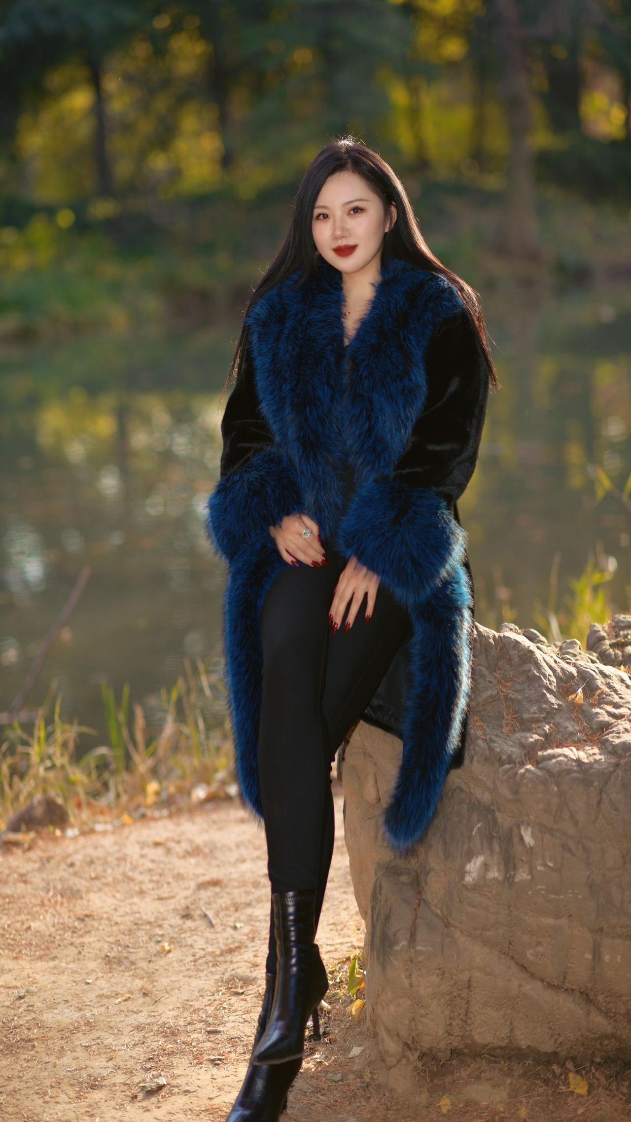 冬日暖阳下,黑裙与蓝毛外套的完美搭配,自然与时尚的完美融合。