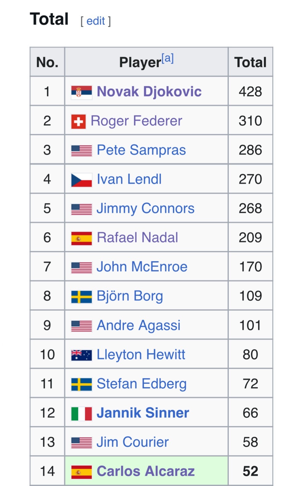 本周阿尔卡拉斯世界第一周数迎来第52周,位列历史第14,前面几位:考瑞尔 58周辛纳 66周埃德伯格 72周休伊特 80周阿加西 101周2026能追到哪里??