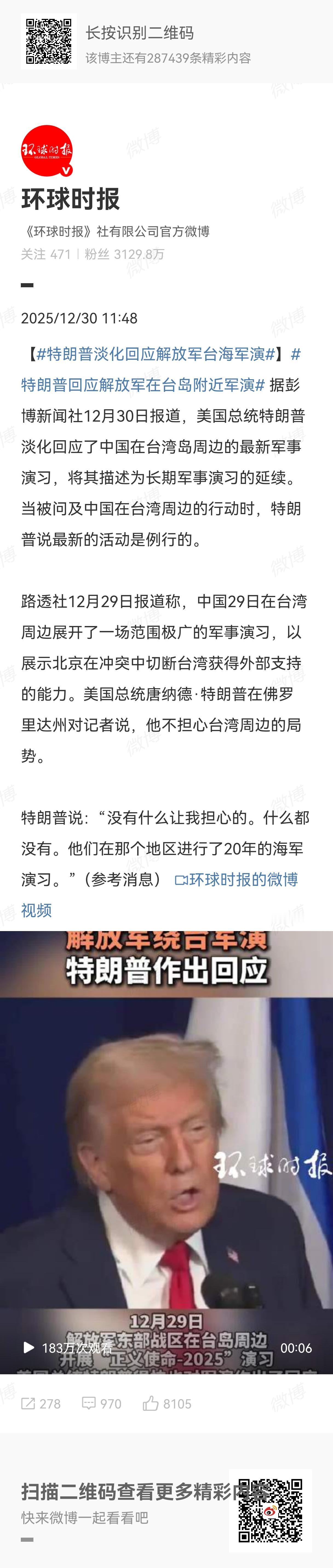 有意思,特朗普总统是这样会议12.29的: 1.我们关系很好:潜台词就是一切尽在掌握之中,我知道今天要军演,提前双方通过气。美空军和台军一起在空中对中国空军喊话是几个意思呢? 2.他们已经在那个地方军演了20年,哦,也许25年了:特朗普总统不想把“正义使命”作为特殊军演,不承认特殊,就代表我认为我还不错。 3.大家对这里的军演有了不同的看法:和2022年那一次不同的是,这一次欧美很平静,没有咋咋呼呼的。但具体有啥不同,还需要多观察。 现在的状况是你说你的、我说我的;你打你的、我打我的。