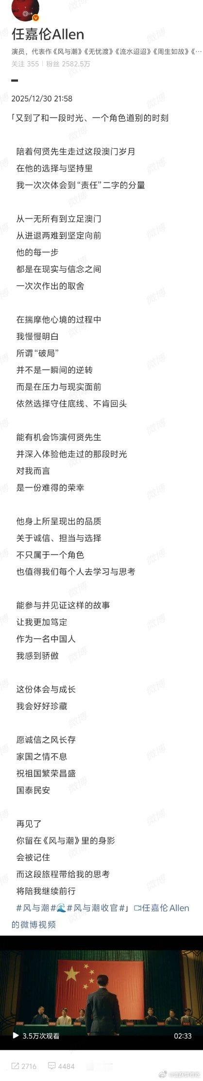 任嘉伦发长文告别风与潮告别何贤!任嘉伦遇到何贤这种有深度有内涵的人生角色,何贤也遇到了能把握住他精神内核的演员,风与潮绝对是一部非常出色的作品故事告一段落,精神持续回响