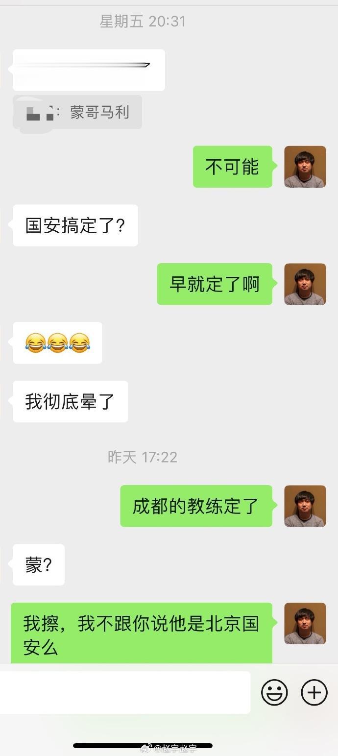 虎扑12月30日讯北京时间12月30日晚上,媒体人赵宇在社媒中晒出了自己与朋友的聊天记录,双方谈论了蒙哥马利到底去哪担任主教练的问题,其中媒体人赵宇向其朋友确认,国安主帅早就定了就是蒙哥马利,这件事没有反转。