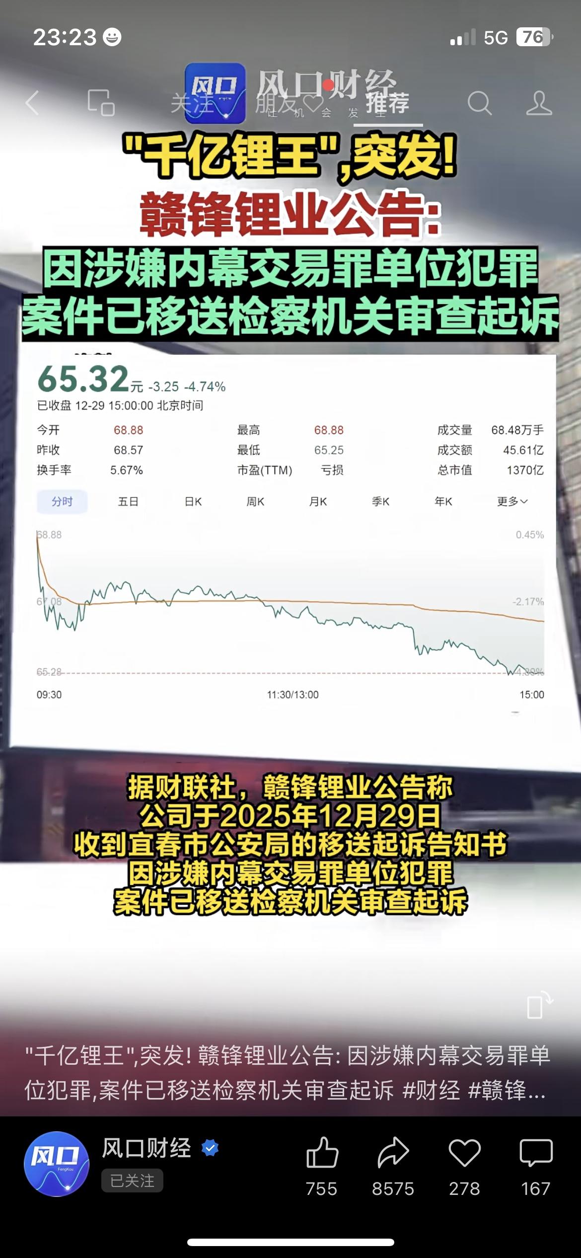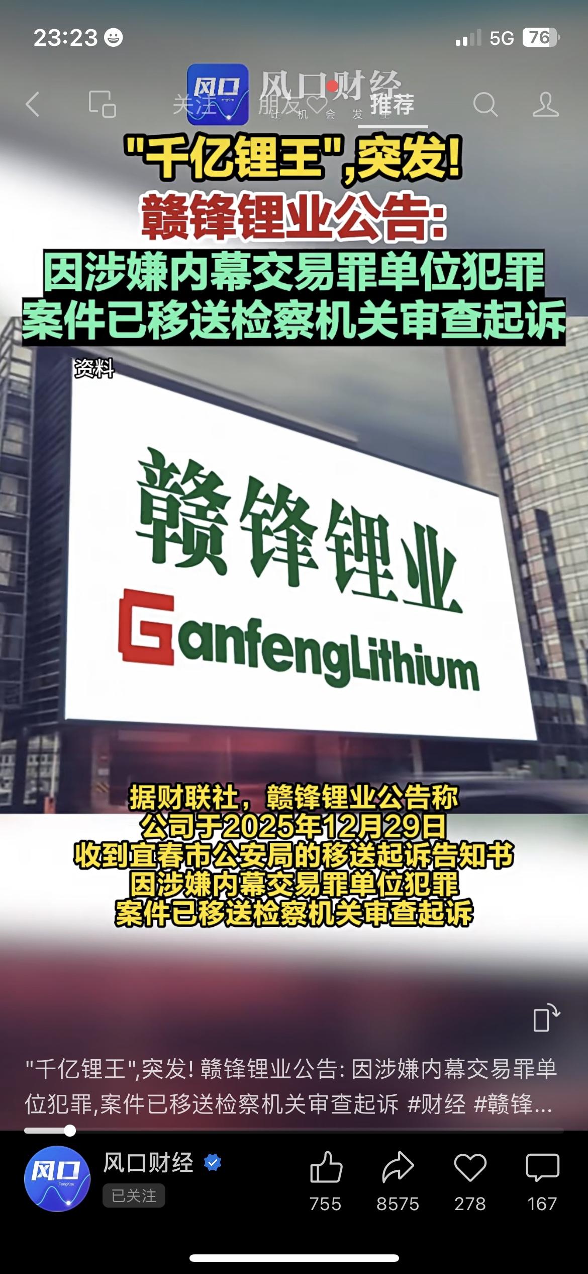 朋友买了赣锋锂业的股票,半夜看到公告直接失眠了 赣锋锂业因涉嫌内幕交易罪单位犯罪,案件已送检察院审查起诉 刚收到公安的移送起诉告知书,千亿锂王突然踩雷 持股的股民群里,全是讨论要不要赶紧割肉的消息 你持有锂矿相关股票吗?这次事件会影响你对锂业板块的判断吗?