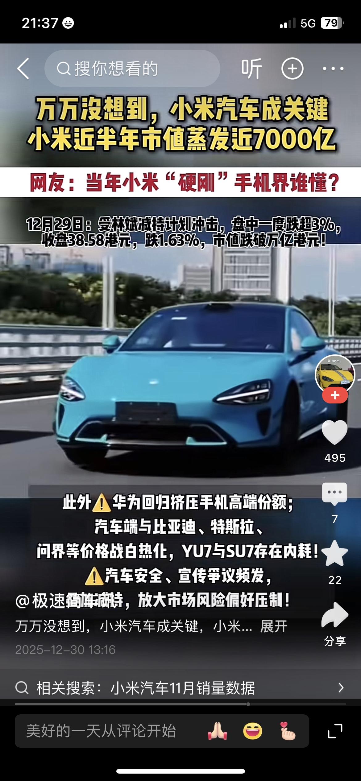 小米市值突然蒸发,老米粉的我有点慌,这些信号要留意 小米动态 昨天刷财经新闻,看到小米市值突然蒸发的消息,手里攥着小米手机的我,心里咯噔一下。 想起当年为了抢首发款小米手机,我和哥们蹲在电脑前守到凌晨,抢到后还特意发了朋友圈炫耀。 财报里的核心数据透出寒意,市场对手机业务增长乏力的担忧,成了压垮市值的一根稻草。 身边不少米粉都在吐槽,现在的小米手机创新点越来越少,价格却一点没降,换机的欲望都淡了。 其实不只是手机,小米的汽车业务刚起步就面临激烈竞争,能不能扛住压力闯出一条路,谁也说不准。 你现在用的还是小米手机吗?你觉得小米接下来该怎么破局?