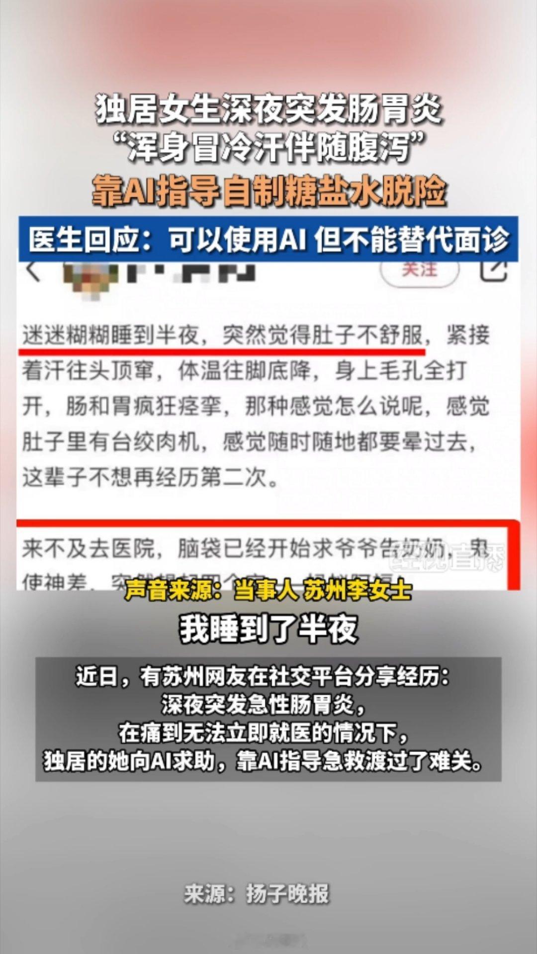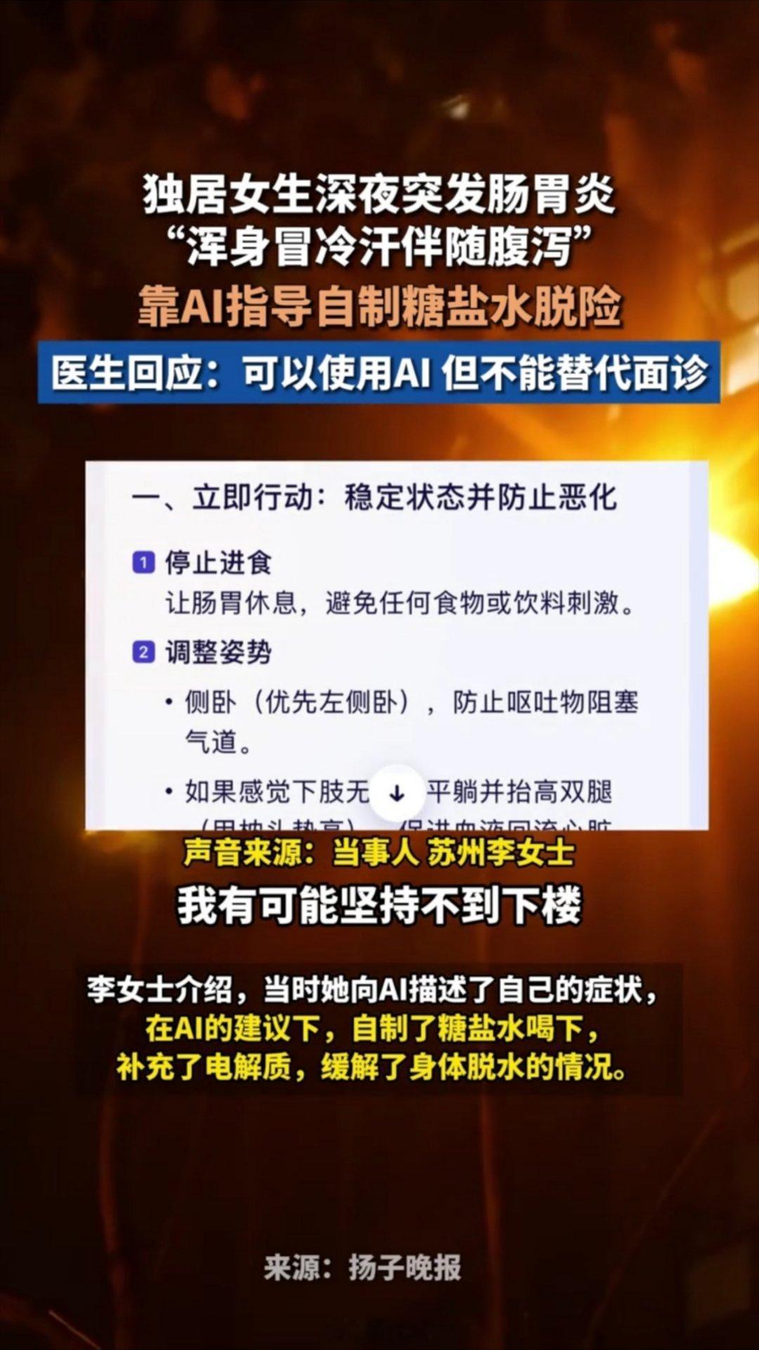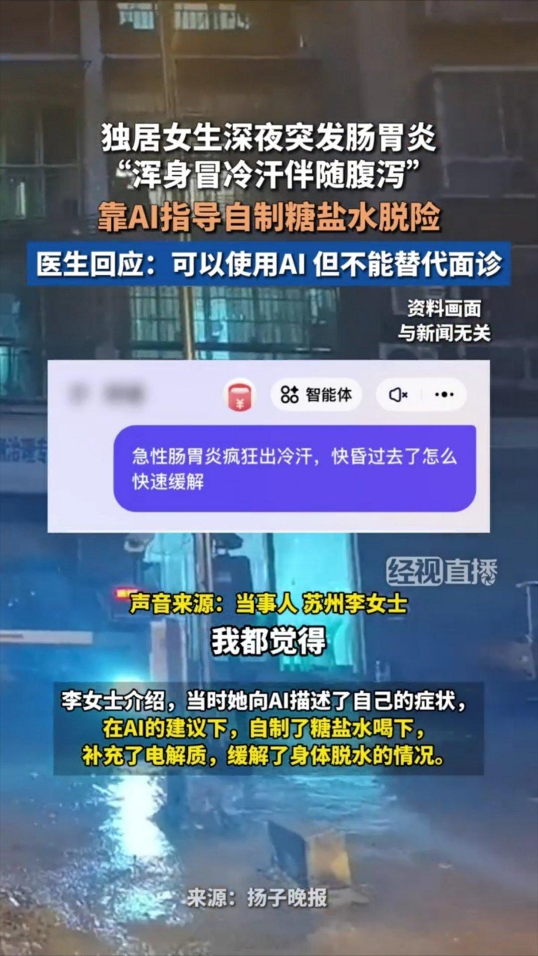 独居女生深夜肠胃炎靠AI自救脱险 补液、保暖、联系120,面对深夜突发情况,AI给出这些基础但又关键的信息,它没有代替医生,但及时给出了清晰的行动建议,的确给慌乱的独居者一颗及时的“定心丸”。我现在遇到一些小问题,也会问一问AI。