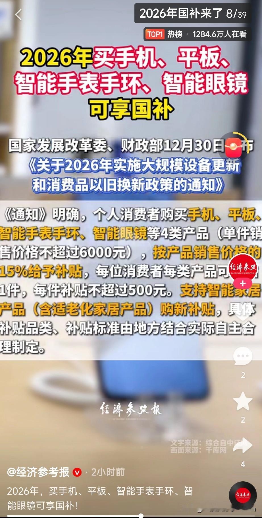 2026年国补来了! 买手机、平板、手表…直接省500元!家人们快冲! 国家发展改革委、财政部刚发通知,2026年的大福利来啦! 买手机、平板、智能手表手环、智能眼镜,统统能领国补!这次补贴力度杠杠的,手慢无。 补贴规则看这里,简单粗暴! ✅ 补贴品类:手机、平板、智能手表手环、智能眼镜(单件不超过6000元)。 ✅ 补贴比例:直接按销售价的15%补贴! ✅ 补贴上限:每件最高补500元! ✅ 每人限1件/类:想多囤?不行!但四类各能买一件,算下来能省2000块呢! 重点提醒! 2026年1月1日启动,但各地上线时间可能不同(比如广东、江苏等地可能1月中旬),赶紧查查你所在地区! 购买渠道:线上线下都能领!网购去京东、天猫,线下找授权门店,付款时直接抵扣! 旧机换新:这次没提旧机抵扣,但很多商家可能有叠加活动,买前问问更划算! 智能眼镜首次纳入:想买AI眼镜、AR/VR设备的冲!以前可没这待遇! 现在就要行动! ✅ 国补资金有限,去年很多地区年中就抢光了!早买早享受,手慢可能白等一年! ✅ 元旦、春节是消费旺季,商家可能还有折扣叠加,双重省钱! ✅ 6000元以内闭眼入!买贵的也不亏,补贴500元顶个半年话费了! 最后说句大实话: 现在物价涨得快,国家发补贴就是让咱少花钱、用新品!无论是换手机追剧,还是买智能设备送爸妈,都是实打实的好事! (文章素材来自经济参考报,侵删)