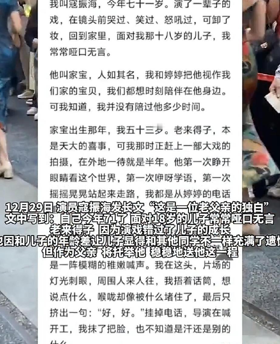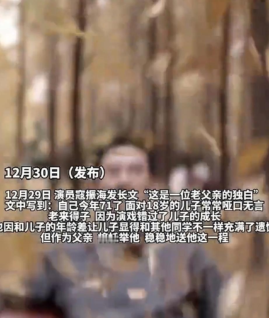 演员寇振海事业有成,在演艺界里享有名气。但因为忙于事业,很少在家,孩子和他比较陌生。有时在空闲时间回到家里,两人面对面常常无话可说。 寇振海今年71岁,孩子已有18岁。他认为两人无话可说的原因,是自己和孩子的年龄相差太大,遭到了嫌弃。发表长文对此表示遗憾。称作为父亲,将托举他,稳稳地送他这一程。 作为父母都面临过选择事业和照顾家庭两难的问题。两者不可兼得,作为男人,一般来说,还是事业为重。因为这关系到养家糊口。不管你万般不舍,也只能这样做。 孩子长大后,也会碰到这样的问题。重要的是要孩子理解,并牢记父母的恩情。不能让孩子认为是父母欠他的。