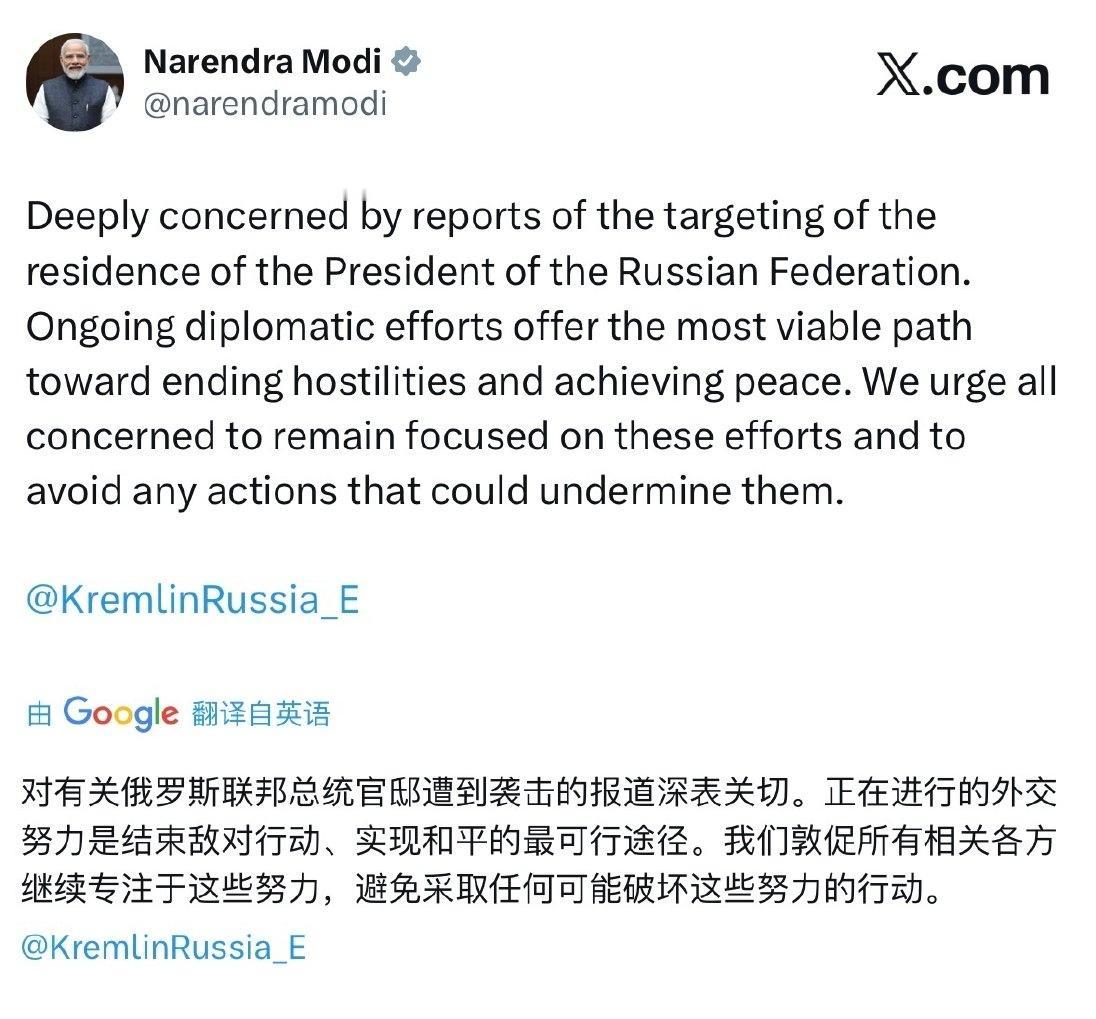 谢里夫和莫迪相继发文回应普京官邸被袭 谢里夫用词比较重、莫迪相对缓和,但都没提“乌克兰”这个词