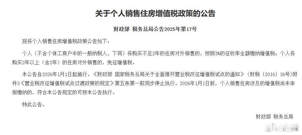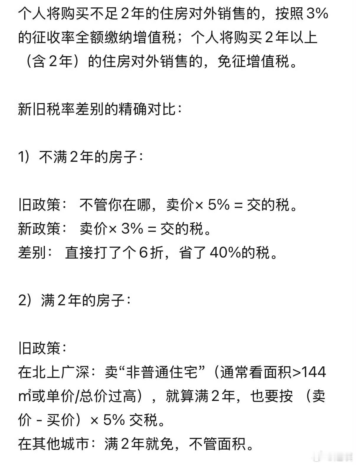 增值税简单来说就是降税了!不满两年的房子旧政策需要交5%的税,新政策降为了3%,相当于打了6折。