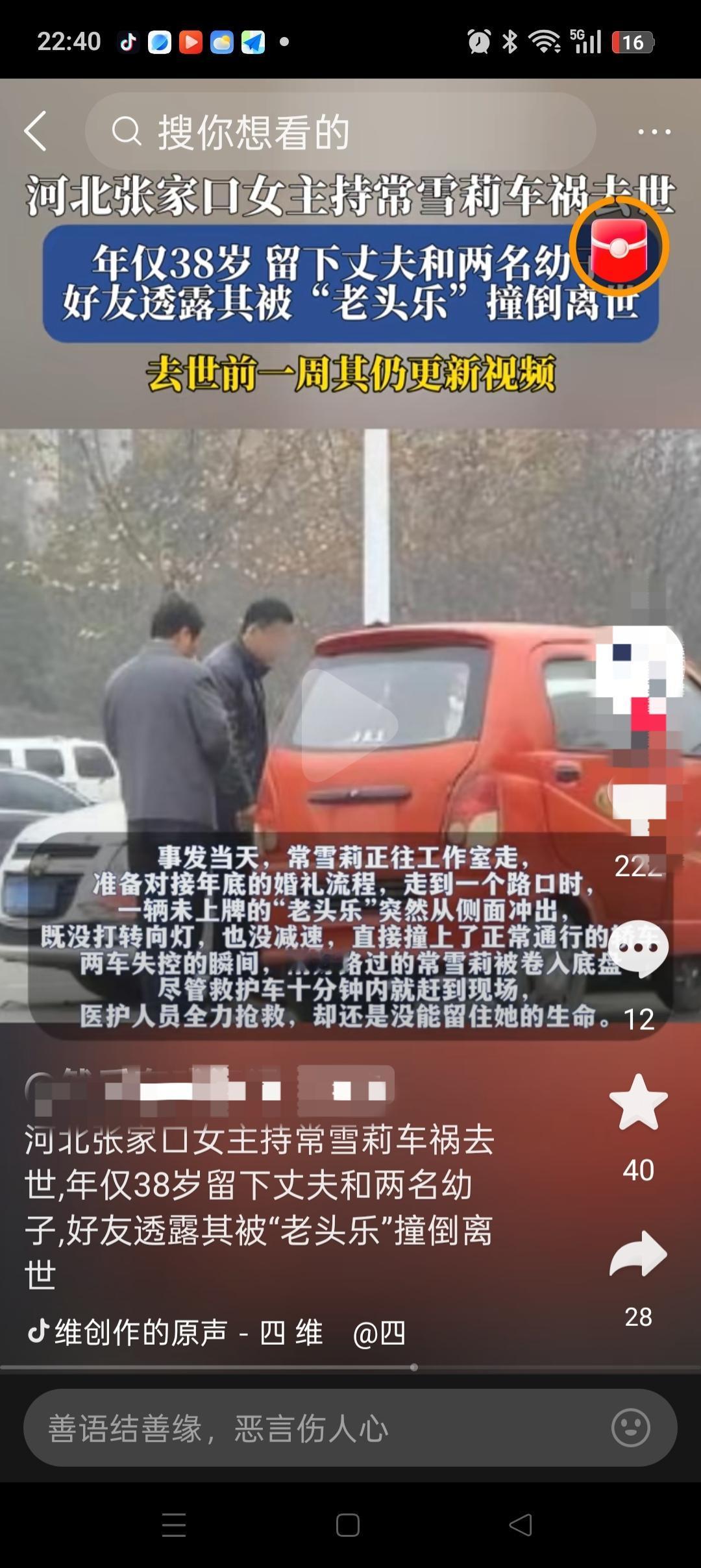 河北被老头乐撞倒离世的38岁女主持人真的很漂亮!她的性格真的非常好,也有一个温暖的家庭,爱她的老公,和两个年幼的儿子。 12月27号,她穿着白色礼服,黑色小皮鞋,正准备往工作室走,去对接年底的婚礼流程。经过一个十字路口时,一辆没有上牌的老头乐突然冲了出来,撞到了正常行驶的小汽车。却不凑巧把路过的她带倒了,卷到了车底。 尽管现场的路人都尽力去帮忙,救护车也在10分钟赶到,还是于事无补。 现在的老头乐太多了,而且大多都是老年人,还没有驾照。他们走在机动车道上,速度慢,不上道,根本不管堵不堵车。遇到红绿灯,也是看心情,完全没有一点守规则的概念,唉。。 好可惜,人生不能重来,只能在此长叹一声,希望她一路走好[祈祷][祈祷][祈祷]