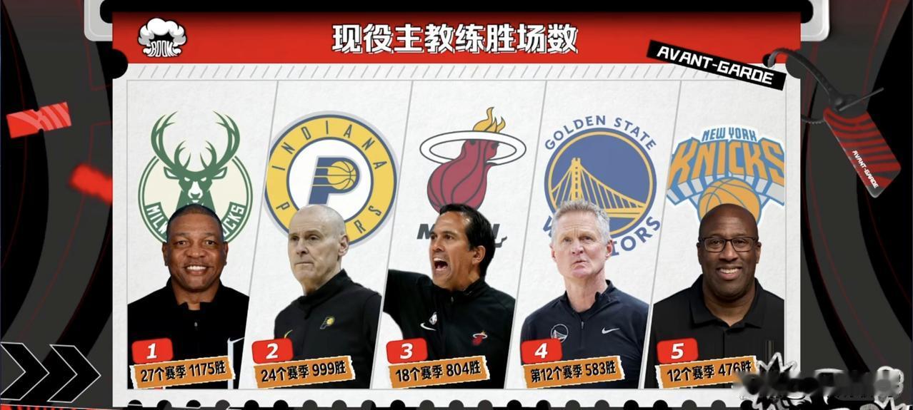 现役主教练胜场数最高排名: 1、里弗斯,27个赛季,1175胜。 2、卡莱尔,24个赛季,999胜。 3、斯波,18个赛季,804胜。 4、科尔,12个赛季,583胜。 5、布朗,12个赛季,476胜。
