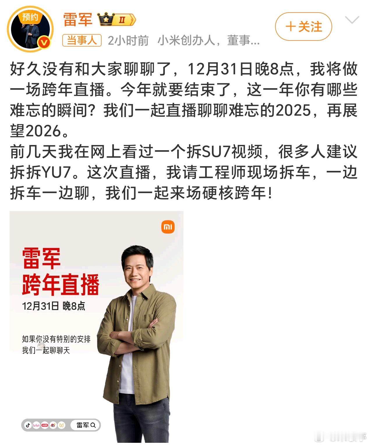 雷军跨年直播拆车雷军又要跨年演讲了,大家期待吗?看看这次会讲点什么吧…