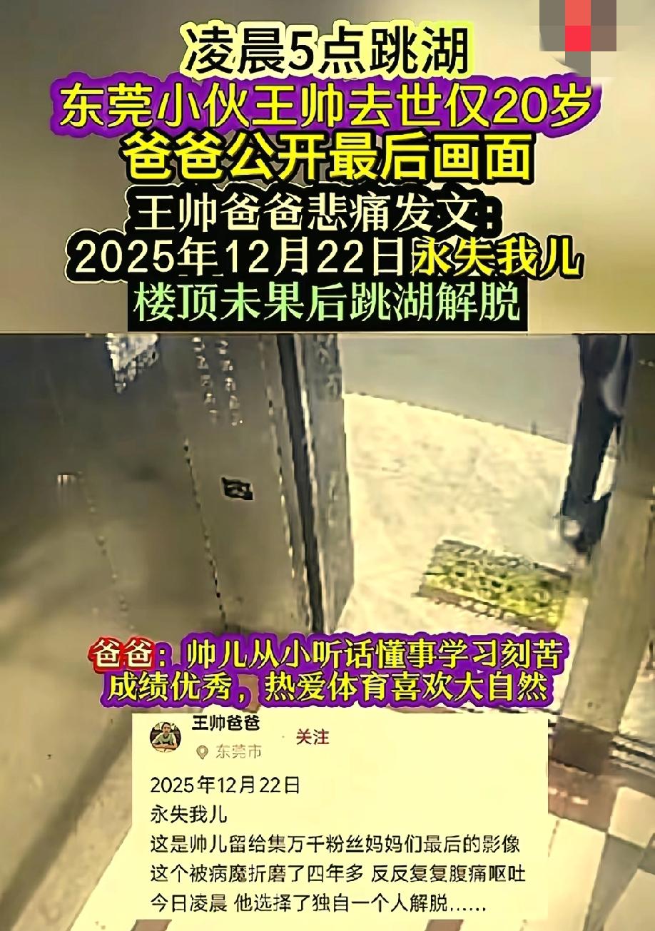 看到王帅跳湖的消息时心情久久不能平静,年仅20岁的他以这种方式结束自己的生命是有多么无奈。 东莞小伙王帅是多少父母眼中优秀到几乎没有缺点的孩子,从小听话成绩优异,奖状贴满出租屋,上当地最好的高中,当一切都那么美好时,偏偏这时命运和他开了一个天大的玩笑。 高一那年他被查出格林巴利综合症,吐到吃不下,全身抽搐疼痛难忍,走路摇摇晃晃,父母全力以赴的奔波求医,甚至生下女儿存脐带血,可这些努力如同石沉大海没有丝毫的改变现状,王帅被病痛折磨了四年,他或许不忍父母为他受苦受累,或许是病痛的折磨让他彻底心灰意冷,他选择凌晨五点跳入冰冷的湖水中结束了自己的生命来做彻底的告别。 愿天堂里再没有病痛折磨,愿这样的诀别再也不要重演。王帅一路走好,家人节哀!