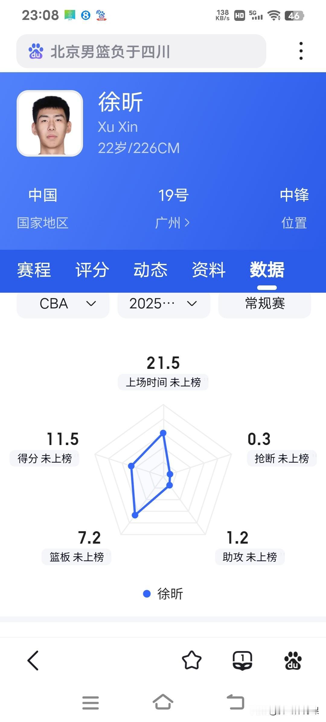 开始打脸了!杜锋不得不承认。 截止CBA常规赛第8轮,徐昕租借广州队后的数据是,场均出场时间21.5分钟,场均贡献11.5分7.2篮板1.2次助攻,已经开始展露虎牙。 徐昕 22岁,身高2.26米,体重128公斤,效力广东三个赛季,场均出场时间仅10.2分钟,场均贡献4.1分3.8篮板,而且大多数还是垃圾时间登场,合同到期后,徐昕因不满出场时间主动提出转会申请,对自己的能力非常有信心,不想继续烂在杜锋体系里。 如今,联赛仅过了第8轮,徐昕的数据已挤进联赛前5中锋,现在看来,杜锋有点被打脸了,若新赛季徐昕能留在广东,球队内线篮板更有保障。