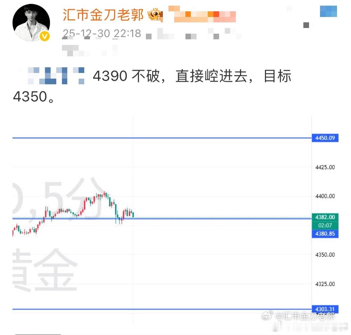 黄金 老郭晚评:4380决战前的蓄势,美盘关键时间 当前盘面处于“上有顶、下有底”的震荡蓄势期。日内虽说多头表现强势,成功收复4360并逼近4380关键阻力位。目前价格在4380下方徘徊,多空在此处展开拉锯。今晚美盘是关键,需重点关注21:00-23:00这个时间窗口,观察价格对4380-4410区间的反馈。若站稳4380,则上看4410甚至更高;若受阻回落,则需防范二次探底4300的风险。一、 基本面复盘与多空逻辑再平衡1. 东欧“暗战”提供底部支撑 俄罗斯2026年征兵令(26.1万人)与乌克兰袭击俄高官官邸事件,表明俄乌冲突正从“热战”向“总体战”演变。这种 “物理升温” 是黄金最坚实的避险买盘来源。它锁定了金价的底部,使得黄金很难出现“崩盘式”暴跌,因为任何军事升级都会瞬间激活避险资金的入场。 对今晚的影响: 只要东欧没有传来“全面停火”的实质性利好,这股避险买盘就会像“定海神针”一样,托住金价不跌破4300。2. 亚太“预期管理”*爆发空间 特朗普对解放军绕台演习的“轻描淡写”表态,极大地钝化了亚太地区的避险情绪。作为即将上任的美国总统,他的态度决定了资本对区域冲突爆发概率的定价。市场目前认为亚太局势在短期内不会失控,这使得资金不愿意在这个位置大举押注黄金单边暴涨。 对今晚的影响: 这是黄金冲击4400大关的“天花板”阻力。在缺乏新的、更具爆炸性的地缘利多(如台海实弹演习、航母对峙)之前,多头会显得比较谨慎,上涨动力可能主要来自于技术性修复而非恐慌性抢筹。二、 技术面与资金面:日内战绩与美盘推演1. 日内战绩复盘(三连胜逻辑)亚盘(4325多): 精准抓住了早盘的低点支撑,依托4300上方的震荡底背离,博取了日内的第一波反弹利润,目标直指4380。欧盘(4380空): 完美卡位了日内第一波冲高的阻力位。4380作为前期的震荡平台和日内多空分界线,具有极强的技术性抛压。在未能放量突破前,此处短空收割了一波回落。插针多(博反弹): 在快速洗盘(插针)后,资金回流,再次博取了向上的修复,目标4410。公开福利,4390 为防守区域,看向 4350 附近。总结: 今天的行情验证了 “4300-4380区间震荡” 的逻辑,且市场在通过反复拉锯来消化消息面。2. 美盘关键推演今晚美盘是决定明日走向的关键。我们需要密切关注4350这个“多空风水岭”。剧本一:诱多回落信号: 价格在9-11点期间,快速冲高至4410附近(或触摸4380即回落),但K线收出长上影线或出现明显的抛压盘口。大跌后“修复”走势。上方4400整数关口和前期高点阻力巨大,多头力竭。价格将掉头向下,第一支撑看 4360-4350 区间。剧本二:破位下行信号: 价格在美盘时段有效跌破4350,且反弹无力。意味着日内多头的反攻失败,空头卷土重来。市场将重新测试 4300 的整数关口保卫战。若4300失守,下方空间将进一步打开。剧本三:获取支撑反弹信号: 下修阶段,站稳4350,且伴随成交量放大。这意味着多头修复意愿依旧强势。上方空间打开,第一目标看向 4410,甚至可能去摸4420。三、 晚间交易策略建议核心逻辑: 4350是今晚的生命线。4380是今晚的起跳板站稳看多,受阻看空。风险提示:1. 警惕“插针”: 年底流动性较差,容易出现瞬间的急涨急跌(插针)。挂单交易务必带好止损,切勿重仓赌单边。2. 数据干扰: 关注今晚美国房价指数和PMI数据,若数据意外大幅走弱,可能成为多头借机反攻的“助攻”。一句话总结:今晚美盘,4380定多空。站稳则去4410,受阻则回4350。守住4300,多头就有翻盘的希望;跌破4300,则需防范“二探”后的深度回调。各位大帅,今晚且看且小心。