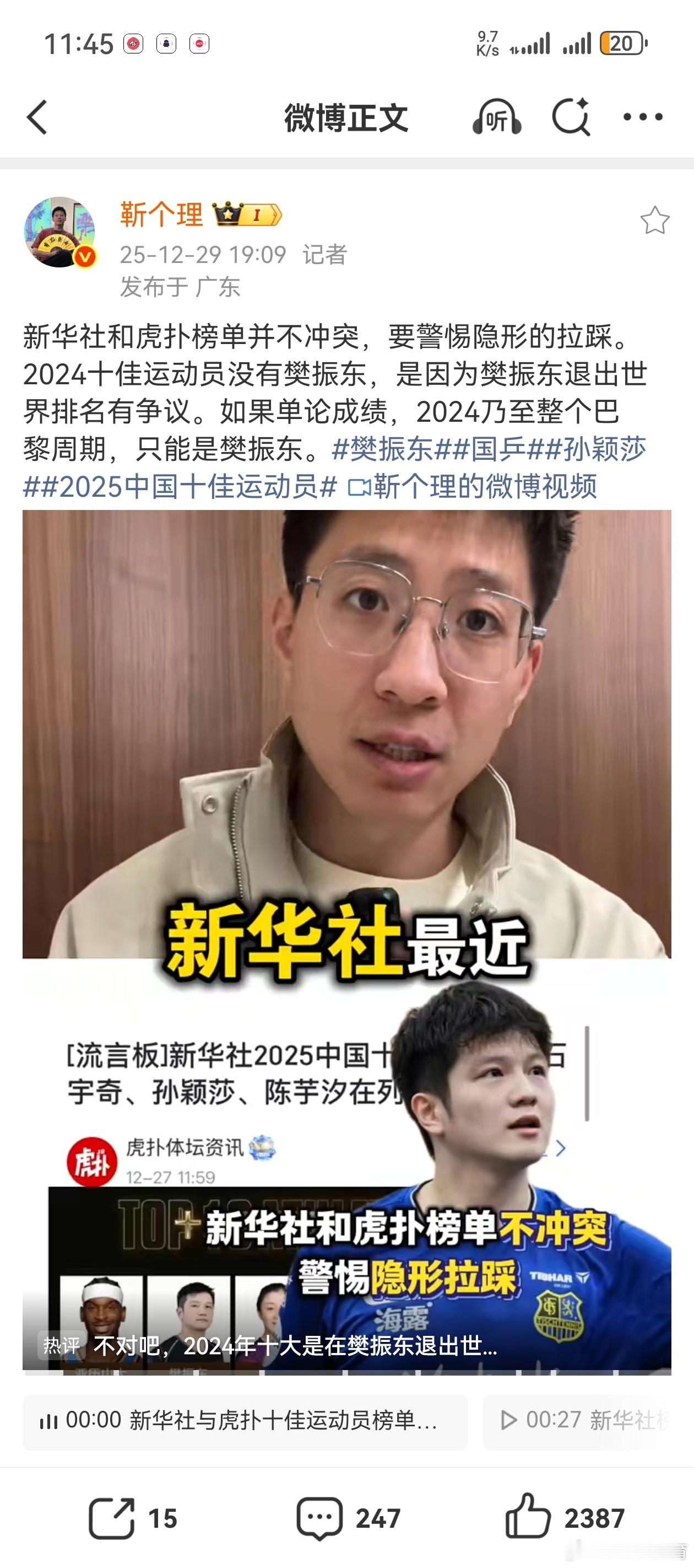 新华社也好,虎扑也是都是平台评选的而已,而且都是人评选的,樊振东不管是在哪里当之无愧,今年最重要的比赛他就是全运会,樊振东夺得了最主要的一个冠军,去年拿了一个最大的奥运金牌,所以说网上一些人戾气别那么重,不知道的还以为给了个劳伦斯呢乒出精彩