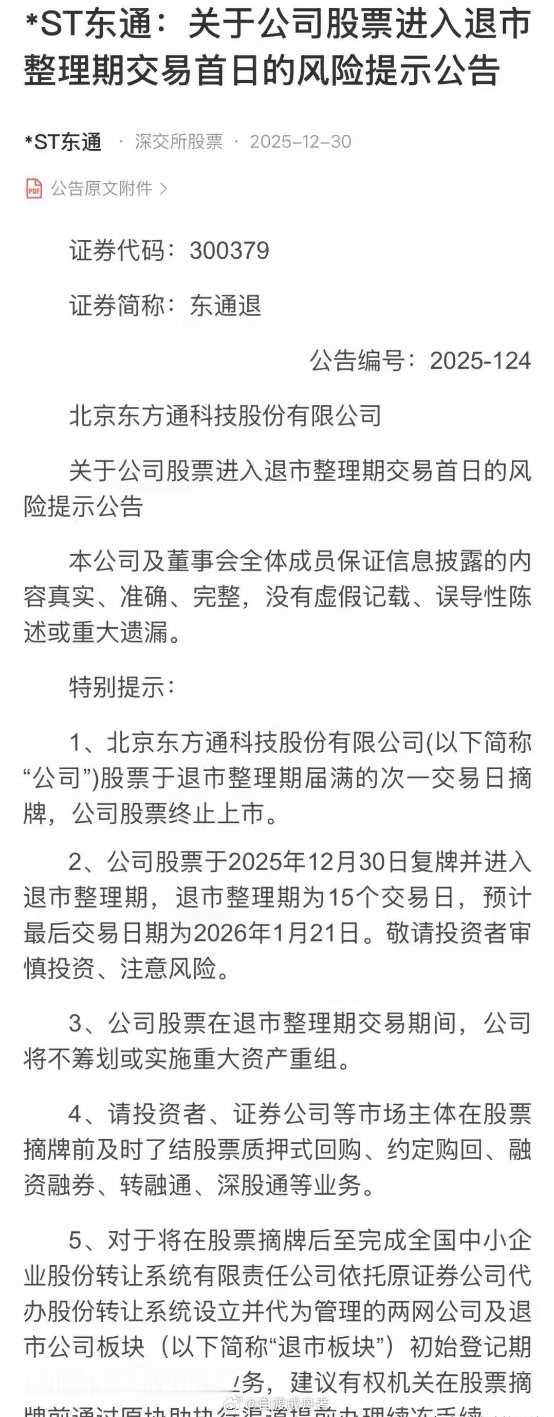 ST东通复牌即遭遇“惊魂一跌”,首日直接暴跌59%,即便在停牌前一天低位抄底的资金,如今也已亏损50%,这记重锤给所有投资者上了深刻一课。回溯来看,该股11月25日曾大涨7.86%,当日2.24元左右入场的资金还一度浮盈13.5%,不少人盘算着次日冲高获利20%便离场。然而11月26日的突然停牌打破了所有计划——这并非普通停牌,而是进入退市整理期前的“最后通知”。一个月后复牌,该股直接迈入退市整理期最后15个交易日,因首日无涨跌幅限制,开盘便大跌56.62%,全天在跌60%左右震荡,前期所有进场资金悉数被套。要知道,停牌前该股还曾两次拉出20cm涨停,正是这种短期波动让部分投资者忽略风险,抱着“短线博弈反弹”的心态入场,明知是强制退市风险股,却总存侥幸,结果一停牌便陷入被动。更令人警醒的是,这并非个例。ST广道退市整理期首日大跌71%,后续虽有三日反弹诱多,最终还是连续跌停,如今只剩最后一个交易日便终止上市,博反弹的资金全部被套;ST苏吴退市整理期首日跌67%,短暂反弹后继续下探,最终以0.29元退市。ST东通的退市早已埋下伏笔:2019年至2022年连续四年虚增收入和利润,2022年定增还涉及欺诈发行,触及强制退市红线。即便如此,仍有投资者在已知风险的情况下入场,如今股价虽跌至1.23元,但作为退市股仍显偏高,后续下跌风险仍在。从年内跌95%到复牌暴跌59%,从短期浮盈到深套50%,ST东通用血淋淋的现实证明:面对退市风险股,任何“侥幸博弈”都是在刀尖跳舞,敬畏风险、远离问题股,才是对自己账户最基本的负责。