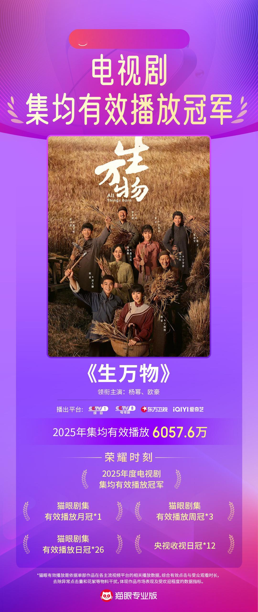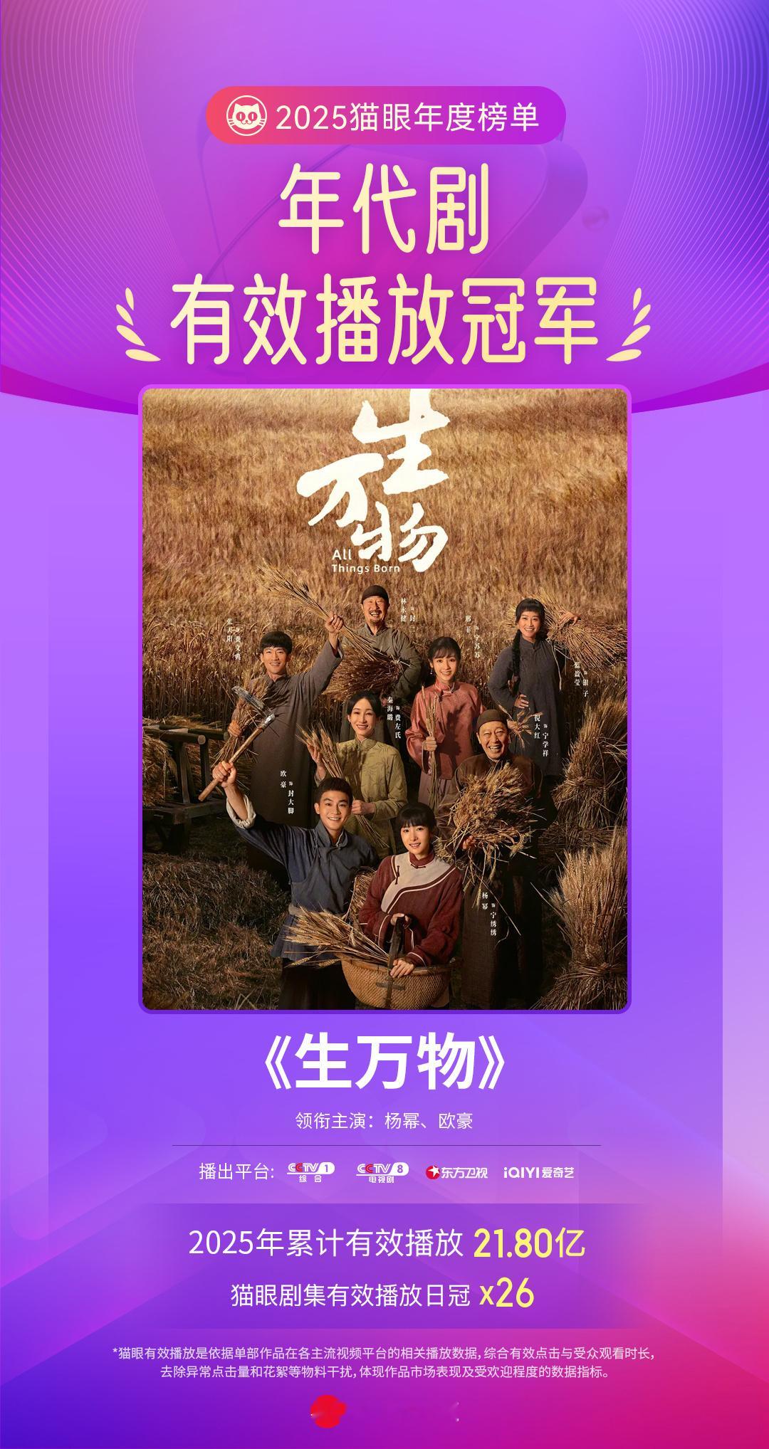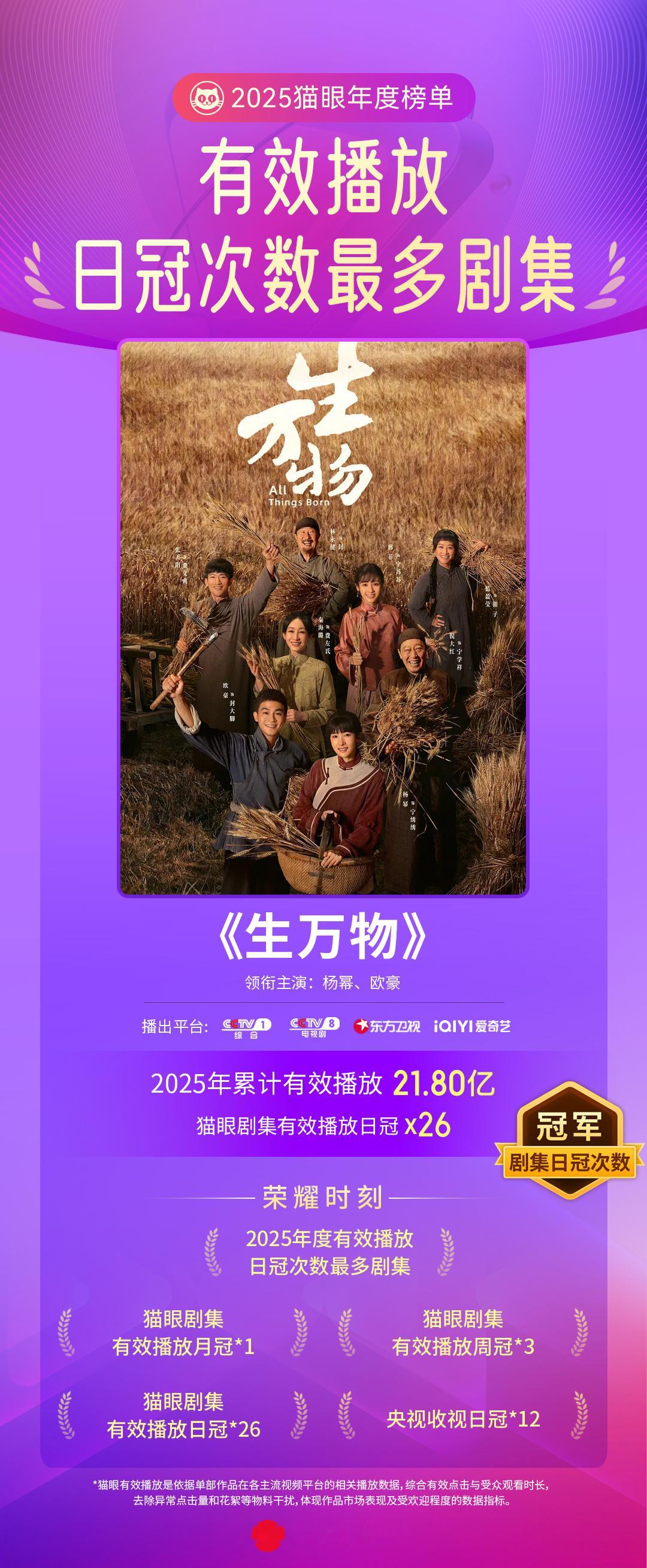 猫眼平台的2025年度榜单也要记录下啦《生万物》 又又获得多个冠军!👏🏆2025年代剧热度冠军,热度日冠x24🏆2025年代剧有效播放榜冠军(21.60亿)🏆2025电视剧集均有效播放冠军(6057.6万)🏆2025年有效播放日冠次数最多剧集(26次)杨幂生万物杨幂宁绣绣