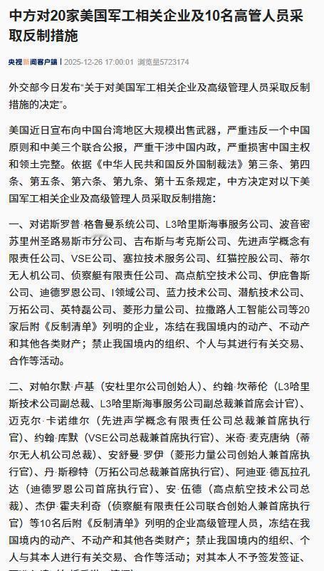 圣诞节后的第二天,白宫收到了一份让华盛顿瞬间清醒的通知。12月26日,中国外交部第19号令直接点名20家美国军工巨头和10名高管,资产冻结、合作叫停、签证吊销,没有任何铺垫,没有缓冲期,公告发布即刻生效。美国媒体惊呼,特朗普政府这次被上了一课,他们压根没料到中方反应能这么快这么狠。 ​ 最疼的地方被精准戳中了。诺斯罗普·格鲁曼原本计划当月进行新一代红外制导模块测试,结果深圳一家关键供应商停止发货,测试节点整体后移至少两周。更尴尬的是F-35战斗机的钐钴永磁体供应,这种导航系统核心材料现在完全依赖法国一家废弃工厂的库存废料,而库存只够支撑一年产量。全球90%的稀土磁铁加工产能集中在中国,美国本土产业链早在几十年前就因成本问题转移了。 ​ 这份制裁清单覆盖了美军武器系统的关键环节。诺斯罗普·格鲁曼生产F-35的雷达和导弹制导系统,L3哈里斯提供军用通信模块,波音圣路易斯分公司负责"鱼叉"反舰导弹。这些企业长期参与对台军售,仅过去五年相关销售额就超过230亿美元。中方这次没放空炮,直接冻结他们在中国境内的所有资产,禁止与任何中国组织和个人交易。 ​ 华盛顿显然低估了中方的决心。特朗普团队此前还试图通过"边施压、边释放缓和信号"的方式寻找操作空间,甚至在12月初搁置了部分针对中国国家安全部门的制裁,想换取某种默契。结果中方用行动告诉他们,在核心利益问题上不存在"观察期"。这种出手方式的冲击不在于制裁本身,而在于完全跳过了前置阶段,没给白宫内部评估、应对、调整话术的窗口期。 ​ 连锁反应迅速蔓延。五角大楼内部报告显示,若中美军事科技供应链全面脱钩,美国军工企业的单项制造成本将上涨15%至30%。华尔街数据更直观,2025年四季度美国防务股表现跑输大盘3.7%,多家企业季报提及"供应链不确定性"。股东因股价下跌向管理层施压,部分企业已经开始游说政府调整政策。 ​ 真正让军工体系不安的是这次反制的精准程度。制裁首次将个人责任明确纳入框架,10名美方高管被直接点名,涵盖企业创始人、财务高管及亚太事务负责人。这打破了以往"企业行为、个人免责"的隐性默契,释放出极为清晰的信号,推动军售决策的是具体的人,这些人需要为行为承担现实代价。 ​ 更关键的是,此次反制并未触及人工智能、通信技术、能源等更广泛领域,却已经产生明显震动。这种"留有后手"的策略本身就构成持续压力。一旦红线被反复试探,反制范围是否扩大将成为悬在白宫上方的不确定变量。 ​ 美国国务院只能回应称对台军售是"政策惯例",但对中方的实际行动缺乏有效反制措施。彭博社等美媒认为,这显示中国已改变博弈规则,从"口头警告"转向"实质打击"。中方通过科技自主、贸易多元化等措施降低了对美依赖,而美国在稀土、电子元器件等领域对中国供应链的依存度不降反升。所谓"去中国化"战略在现实面前显得苍白无力。 ​ 现实已经给出了答案。传统的战略模糊与节奏控制,已经无法应对这种即时、精准、系统性的反制方式。留给调整的时间正在迅速减少,白宫需要重新评估的不只是个别项目,而是整个对华策略的可行性与代价结构。 ​