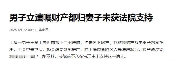 上海,一男子生前留下遗嘱,把自己所有的财产都给了妻子。可当男子去世后,妻子想要按遗嘱过户房产时,却遭到了法院的干涉。法院称:“你不能继承男子的全部遗产。”男子的妻子忍不住问道:“遗嘱难道不是有最大效力吗?为什么不能继承?”
