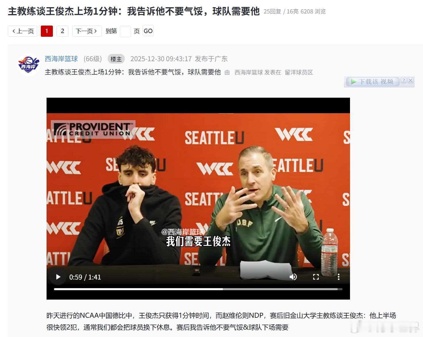 明天早上又有旧金山、西雅图的比赛了,关注王俊杰、赵维伦和淡厚然的不要错过了海外中国球员闯美的篮球青年 旧金山教练上场赛后再次强调说,“我们需要王俊杰”