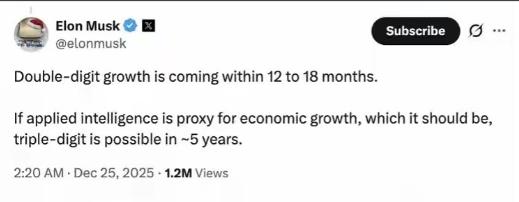 美国GDP很快还要翻倍?马斯克突然发布惊天大预言!美国经济很快要爆发增长,因为Ai智能应用!真的令人觉得不可思议! 马斯克这张嘴一开口,科技圈和经济圈都跟着震动了一把。毕竟是在科技圈呼风唤雨的人物,他说出来的话自带流量,更别说还是“美国GDP很快翻倍”这种级别的惊天预言,听着就足够刺激。 他在社交媒体上抛出这枚“经济重磅炸弹”的时候,那股子信心劲儿藏都藏不住,直言未来12到18个月里,美国经济就能冲进两位数增长的时代,而这一切的核心引擎,就是人工智能的爆发式应用。 他的这套逻辑,说白了就是押注AI技术会迎来指数级的进化。甚至还放话说,要是把AI落地应用当成增长指标来看,五年内实现三位数增长都不是什么天方夜谭。 这话听着确实够大胆,但他敢这么说,也不是完全空口白话,多少是靠着自己旗下那些布局AI的产业撑着底气。 特斯拉的Optimus机器人反应速度都快赶上人类的十倍了,要是将来年产量能冲到10亿台,单靠机器人这一块业务就能造出30万亿美元的收入;SpaceX的星舰计划要是能成,全球物流网络都得被重构一遍,运输成本能往下压90%以上; 还有xAI团队搞的Grok大模型,迭代速度快得吓人,一周就更新一次,眼看着就要逼近通用人工智能的临界点了。 而且现在美国经济的一些变化,好像还真有点在印证他预言的意思。就说美国商务部公布的第三季度GDP数据,虽然全年增速预计也就2%左右,但当季增速已经回升到4.3%了。 更关键的是,这季度GDP增长里,出口的贡献率高达8.8%,其中半导体、AI服务器这些高科技产品占了六成以上。 还有非住宅类的固定资产投资,虽然整体增速慢了点,但AI数据中心、机器人生产线这些“新基建”的投资同比增长了23%,这可是实打实的增长动力。 企业那边的变化也挺明显,因为用了AI,劳动生产率提升了17%,制造业人均产出都突破20万美元一年了,差不多能赶上德国的水平了。 现在美国的科技巨头们确实都在AI领域卯着劲干,微软、谷歌、亚马逊、Meta这几家,围着AI算力展开了疯狂竞争,每家都砸了几百亿美元进去,生怕落后一步。 就连个人和企业用大模型都变得越来越常见,就说ChatGPT,周活用户都已经冲到8亿了,消费者接受AI的速度比预想中快多了。 照这个势头看,马斯克觉得AI能拉动经济爆发增长,好像也不是完全没道理,毕竟现在整个美国科技圈都在围着AI转,大量的资金和资源都往这个领域倾斜。 不过话说回来,这预言里也藏着不少没说透的变数。现在美国的联邦债务都突破38万亿美元了,一年的利息支出就占了财政收入的15%,这么大的债务包袱压着,经济想轻装上阵爆发增长,没那么容易。 还有劳动力市场,AI替代效应已经开始显现,11月的非农就业数据都推迟发布了,ADP的数据也显示就业市场一直在走弱,要是大量岗位被AI替代,老百姓没了收入,消费跟不上,经济增长也很难持续。 而且现在美国AI产业看着热闹,其实也有不少内伤。虽然投资砸了不少,但商业变现的路子还没走通,大量的投资更像是在“烧钱”。就说那些消费级大模型,用户数是不少,但赚的钱连运营成本都覆盖不了。 大模型跟以前的互联网应用不一样,以前的互联网应用只要基础设施搭好,边际成本基本为零,用户再多也不怕,但大模型每一次回应都要做大量重复运算,用户越多,需要的数据中心和算力就越多,不仅没发享受规模效应,反而越做越费钱。 就算是被寄予厚望的企业云服务,也没好到哪里去,麻省理工学院的报告显示,95%引入AI业务的企业都没赚到钱,甲骨文的GPU云租赁业务毛利率才14%,扣掉折旧后净毛利率就只剩7%了。 但马斯克显然没把这些眼前的困难当回事,他眼里好像已经看到了AI驱动美国经济一飞冲天的场景。 他甚至还提到,要是预言成真,美国可能会率先进入“零工作时代”,到时候AI和机器人包揽90%的生产任务,人类工作都成了可选项,连基本收入保障制度都得跟上。 只不过他也没回避风险,坦言最担心的不是AI取代人类,而是人类因为AI失去存在的意义。 不管怎么说,马斯克这波惊天预言确实把AI和美国经济绑在了一起,也让更多人开始关注AI到底能给经济带来多大的改变。 现在整个科技圈和资本圈都在盯着美国AI产业的进展,毕竟这不仅关乎马斯克预言能不能成真,更关乎全球经济格局会不会因此发生变化。 只是这“GDP翻倍”的目标到底能不能实现,还是得看AI技术能不能真正落地生根,能不能从“烧钱”的概念变成实实在在的生产力,而不是一场短暂的资本狂欢。 毕竟经济增长从来都不是靠预言撑起来的,最终还是要靠实打实的价值创造,现在大家能做的,也只能是等着看这场AI驱动经济增长的大戏,到底会演成什么样。
